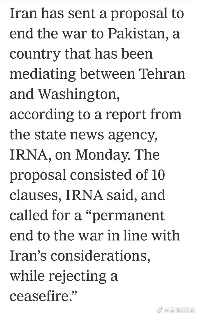 伊朗官媒报道:向巴基斯坦提交了“十项条款”,包括各国安全通行海峡的具体方法、必须取消对伊朗的制裁、美国承诺不再军事进攻等等…不要临时停火、要永久停战