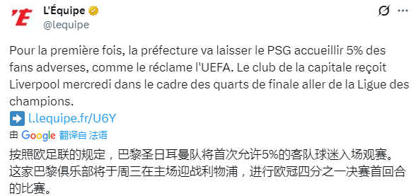 队报:2376名利物浦球迷将前往王子公园球场,现场观战欧冠四分之一决赛首回合。这是第一次,警方允许巴黎接待5%的客队球迷,正如欧足联所要求的那样。
