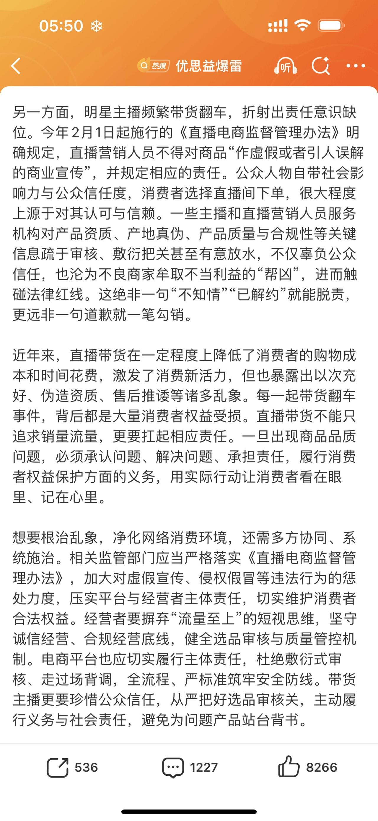 人民日报评明星带货优思益:不仅辜负公众信任,也沦为不良商家牟取不当利益的“帮凶”,进而触碰法律红线。这绝非一句“不知情”“已解约”就能脱责,更远非一句道歉就一笔勾销。 这句话已经定性了。 给董宇辉洗地的说辞是董宇辉没有卖优思益的叶黄素,卖得是蔓越莓,所以没事。 没事的话他为什么要退款?没事应该拒不退款啊。 智搜显示:与辉同行带货优思益创下1000万-2500万元销售额,销量达7.5万-10万单,占该品牌总销量近40%,主要产品包括叶黄素胶囊和蔓越莓口服液。 董宇辉自己曾在直播间大谈选品流程:“很多产品,可能在您看到之前,20天前或者10天前很多人已经吃过了。” 这话现在听起来像个笑话,原来所谓的“试吃”,不过是场精心设计的营销表演,用来掩盖对品牌背景核查的彻底缺失。