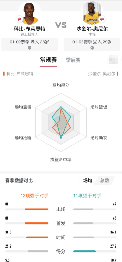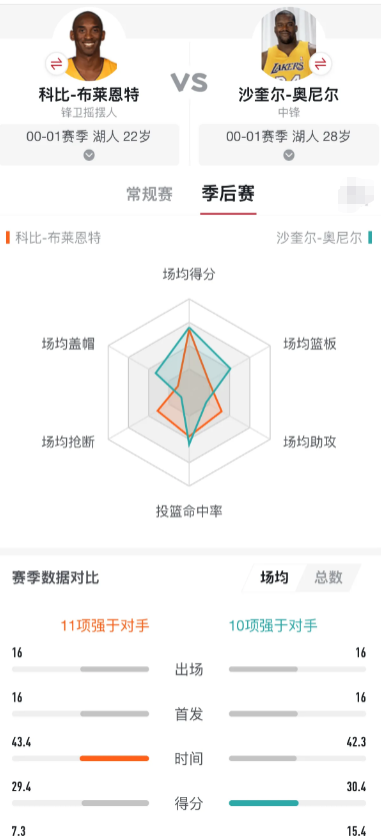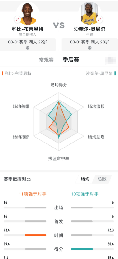 科比和奥尼尔的三连冠,奥尼尔在任何一个夺冠赛季的常规赛场均得分、季后赛场均得分都高于科比。
