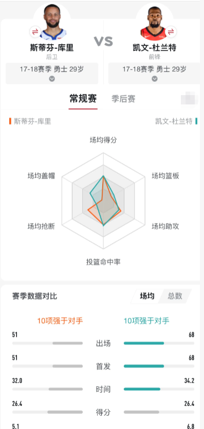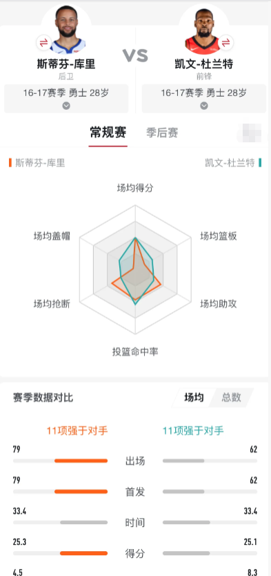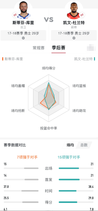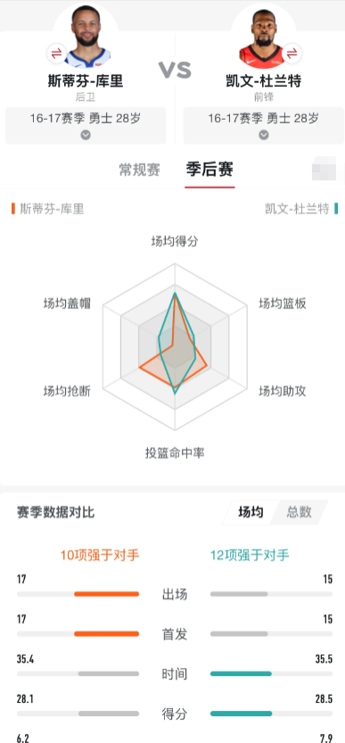 杜兰特和库里的两连冠,第一个赛季杜兰特常规赛场均得分比库里低0.2分,季后赛场均得分比库里高0.4分,第二个赛季常规赛场均得分和库里一样,季后赛场均得分比库里高3.5分。