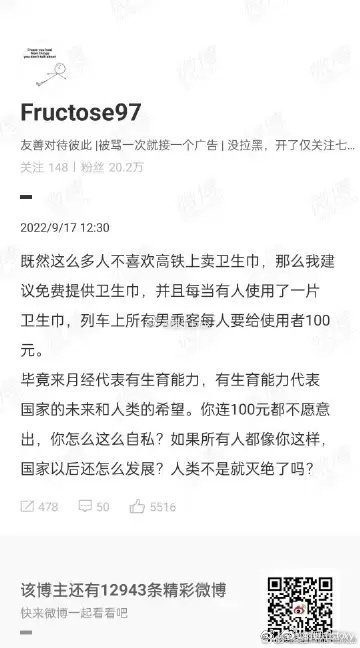 月经弄脏火车卧铺女子发声高铁卖卫生巾这个事件对她们来说早就不是一个简单的“正常诉求”这么简单,而是一个议题,一种“狗哨政治”。这也是这个话题能在这么多年里反复上热搜反复被炒作的原因。这些人的“诉求”根本就不是单纯“卖卫生巾”,卖了卫生巾她们又要求降价,降价了之后又要求免费,再下一步甚至会要补贴都说不定。这不是再提出诉求,这是利用社会议题来谋求特权日拱一卒,用炒作议题跳动对立、撕裂社会,一步一步要求社会资源无限向自己倾斜。所以我们为什么要反对这么一个简单的“诉求”?因为这个“诉求”背后是无穷的贪婪和野心。