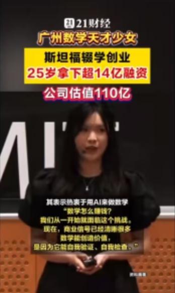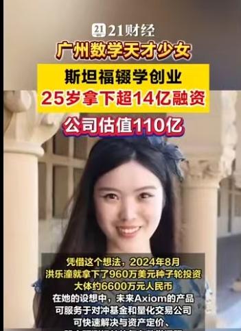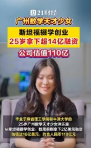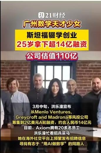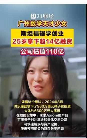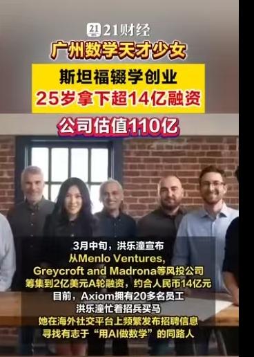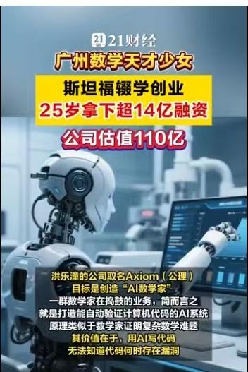 25岁,广州姑娘,斯坦福博士辍学,手握16亿美金估值。 当这些标签集中在一个人身上时,你很难不为之侧目。她叫洪乐潼,如果你对数学圈或者AI前沿稍有关注,这个名字最近恐怕已经刷了屏。2026年3月16日,她创立的公司Axiom宣布完成2亿美元A轮融资,投后估值直达16亿美元(约合人民币110亿元)。这不是科幻小说,这是正在发生的商业现实。 很多人在评论区惊叹她的年轻,毕竟她出生于2001年。但如果我们把时间轴拉长,你会发现这个“天才少女”的剧本,早就埋下了伏笔。 洪乐潼是土生土长的广州人,早年在华南师范大学附属中学就读。2017年,她入选了广东省中学生英才计划,这通常是选拔顶尖科研苗子的摇篮。随后的求学路径简直是在“踩油门”:本科就读于麻省理工学院(MIT),她只用了三年就拿下了数学与物理双学位。注意,这期间她不仅仅是刷学分,还硬啃了20门高等数学课程,顺手发表了9篇论文,其中大部分是与张盛桐合作,刊登在《美国数学会会报》和《拉马努金期刊》这样的顶级刊物上。 2022年,洪乐潼入选“罗德学者”,这个奖项被誉为“本科生诺贝尔奖”,每年在中国仅选拔4人。带着这份荣誉,她前往牛津大学攻读神经科学硕士,同时在伦敦大学学院进行AI和机器学习研究。这份跨界背景至关重要——数学是底座,神经科学是触角,而AI成了她最终落地的战场。 2024年8月,洪乐潼进入斯坦福大学,本该是攻读数学博士和法学博士的双料生涯,但她再次做出了常人难以理解的选择:辍学。同年,她创办了Axiom。 这家公司的名字意为“公理”,目标非常纯粹且硬核:创造“AI数学家”。 市面上大模型很多,但能做严格数学证明的凤毛麟角。Axiom的核心技术路线是利用Lean等编程语言,开发基于形式数学证明训练的可验证人工智能系统。简单说,就是让AI推理的每一步都能被数学验证,绝不瞎编。这直接击中了金融领域的痛点——对冲基金和量化交易员们正急需这种零误差的工具。 数据不会骗人。Axiom旗下的AxiomProver系统在2025年的普特南数学竞赛中拿了满分。这个竞赛被誉为北美最难的大学生数学竞赛,能拿满分意味着AI在逻辑推理上已经达到了恐怖的水准。不仅如此,2025年12月,该系统还自主证明了埃尔德什问题124和481,虽然用时超过24小时,但这标志着机器在数学探索上迈出了实质性的一步。 公司的融资历程也像坐了火箭。2025年刚成立不久就完成了6400万美元的种子轮融资,估值3亿美元。短短不到一年,到了2026年3月,2亿美元的A轮融资到账,估值翻了五倍多,直接跻身独角兽行列。 这种爆发式的成长,自然引发了舆论的热议。有人羡慕,有人质疑。 评论区里,网友“墨镜深蓝”感叹:“人家01年的公司市值几百亿,我家01的天天在家里嘻嘻哈哈。”这代表了一种普遍的焦虑与对比。而网友“彭彭046”则提出了更尖锐的问题:“故事随便你讲,牛逼随便你吹,关键说国籍和在哪国生活工作。”这其实折射出大众对于顶尖人才流失与归属的关注。根据公开资料,洪乐潼是广州人,但她的求学与创业高地目前主要在美国。 无论外界声音如何嘈杂,一个不可忽视的事实是:AI正在从“生成内容”向“逻辑推理”跃迁。洪乐潼和她的Axiom,正是站在这个风口的最前沿。当数学不再是人类独有的智力堡垒,当算法能独立证明那些困扰人类多年的难题,商业价值的爆发只是技术突破后的必然产物。 这位25岁的广州姑娘,正在用一种极其硬核的方式,告诉世界未来的数学和金融该怎么玩。 以上内容仅供参考和借鉴