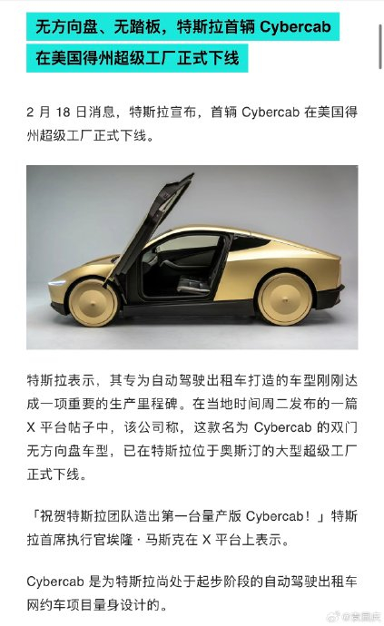 🌍 全球热点特斯拉 Robotaxi 落地:首台纯无人驾驶出租车 Cybercab 在德州工厂下线,马斯克确认 4 月开启规模化量产,正式向无人驾驶网约车转型。