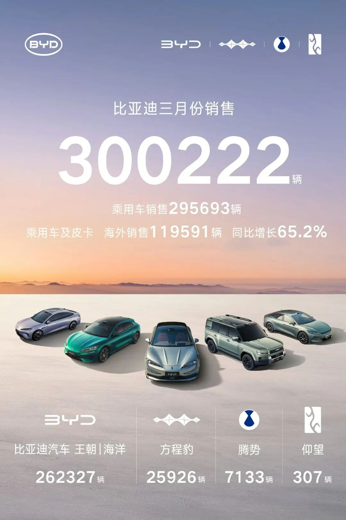 比亚迪技术为核狂飙全球:一季度销量战报出炉,累计卖出超 70 万辆,单 3 月就突破 30 万辆,稳坐全球新能源销冠。