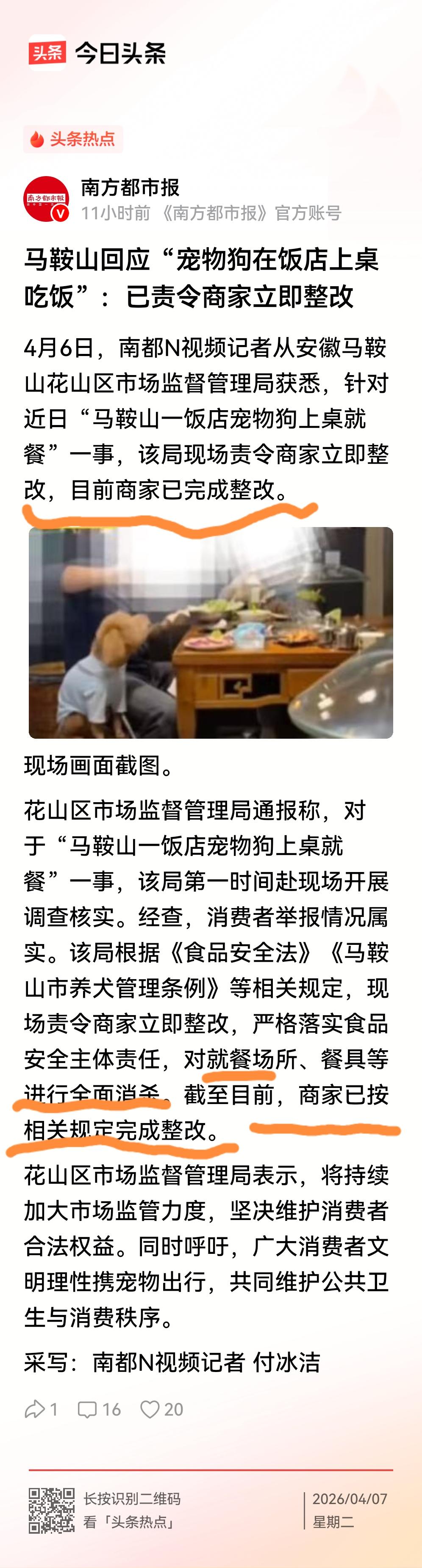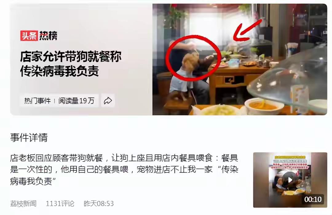 狗上餐桌,应该封杀,不能一改了之! 马鞍山一饭店宠物狗上桌就餐一事,引起广大消费者严重不满。而店家老板不仅不思悔改,还拍着胸脯口吐狂言:“顾客染病我来负责!”真的不知道他哪里来的底气?又不知道,你用什么负责? 不过,当地市监局出手了。结果是现场责令商家立即整改。并称目前商家“已完成整改”。呵呵,我真的不知道商家怎么整改的,打扫打扫卫生,洗洗盘子就完事了?这就算整改完成了? 我看,还是应该封杀了他吧!