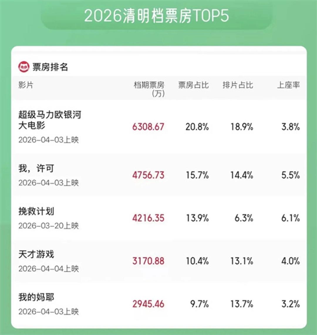 清明档票房,终于落下帷幕了。 据猫眼专业版数据,2026年清明档总票房达3.02亿收官,总放映场次144.2万场,刷新中国影史清明档场次纪录 。 《超级马力欧银河大电影》与《我,许可》稳居票房前两位,成档期最大赢家。 拿下冠军的马力欧,靠的从来不是运气。 作为经典游戏IP续作,它延续了无门槛的合家欢风格,沉浸式闯关体验搭配全年龄适配的剧情,档期票房超6300万,占比超20%,成假期家庭观影的首选。 紧随其后的《我,许可》,是档期里的口碑黑马。 文淇、秦海璐搭档演绎的母女故事,把代际沟通的痛点拍得真实又戳心,豆瓣开分8.3分,档期票房超4700万,靠口碑稳稳站住了脚跟。 很多人说,清明档是电影市场的淡季,票房疲软没看头。 可事实是,这个档期有超20部新片上映,覆盖亲情、悬疑、科幻等多种类型,最终能跑出来的,全是靠内容说话的作品 。 观众从来不会吝啬电影票,只会为好内容买单。 电影市场从来没有所谓的淡季旺季,只有好片和烂片。 不管是国民级大IP,还是接地气的小成本现实题材,只要拿出诚意打磨内容,就永远能被观众看见。