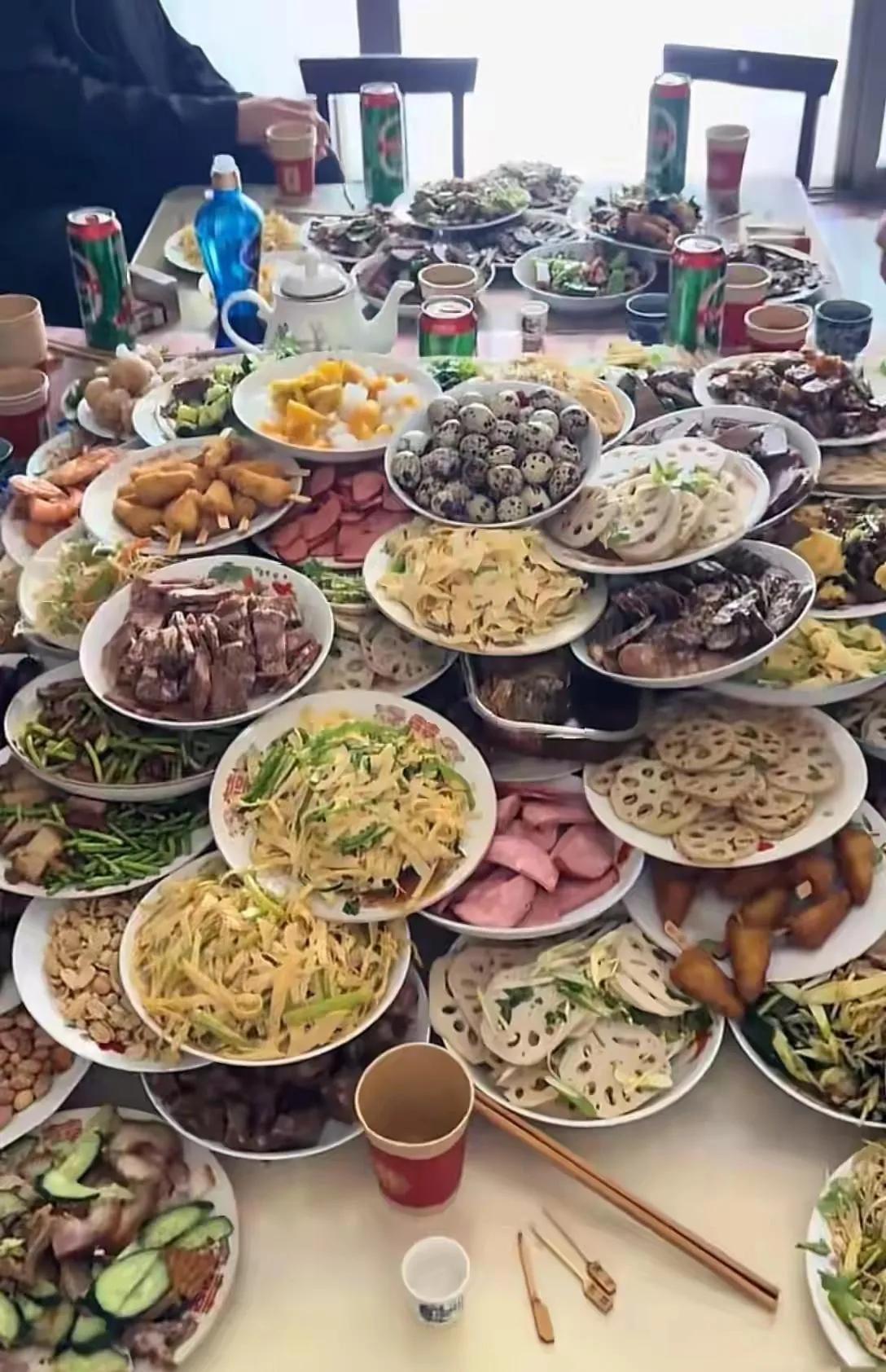 不知道是不是AI。这桌菜看上去很丰富,实际上很有问题。一是重复的菜很多,感觉是几桌菜先摆放在一起。二是摆盘杂乱无章,影响食欲。三是菜虽多但没有一个拿得出手的硬菜。