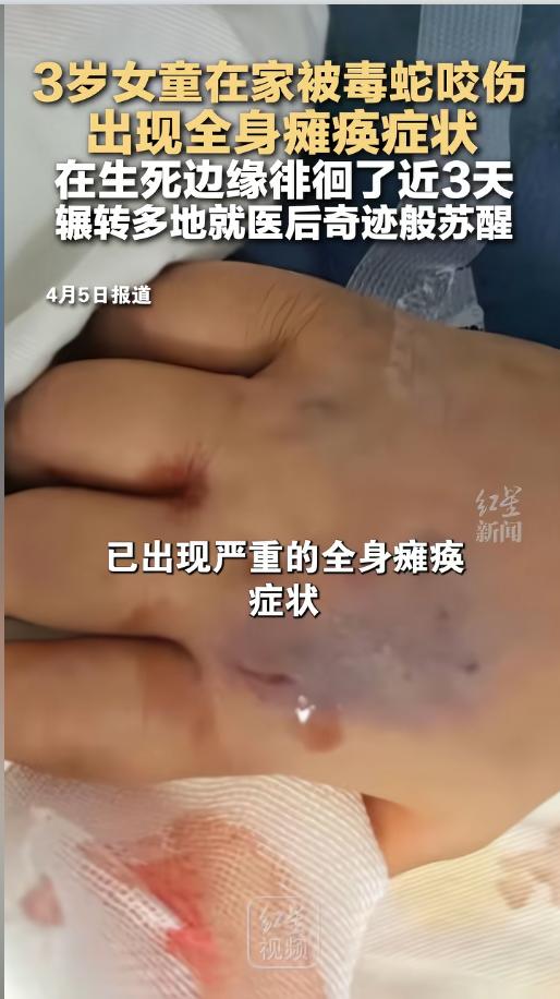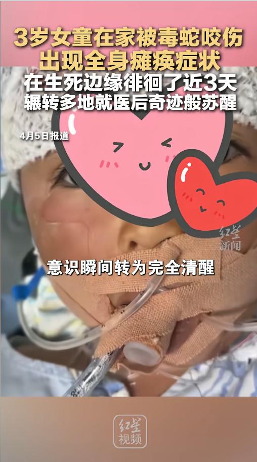 “命真大啊!”3月27日,云南文山,在家中不慎被毒蛇咬伤,等送到医院时,就已经出现了瘫痪等症状,随后陷入“假死”状态,在生死边缘徘徊。为了求医,小女孩辗转多地,在南宁一家医院,注射了足量的抗毒血清后,竟奇迹般的苏醒了! 被毒蛇咬伤是件很危险的事,更危险的是,咬完蛇直接跑了,不知道是什么蛇咬的。这种情况下,打什么样的抗毒血清都没法确定。 据媒体报道,小女孩才刚三岁,事发那天,在家里面被毒蛇咬了。家长听见动静后,赶紧就送了当地医院。中间仅仅半小时的时间,女孩就出现了呼吸衰竭,还有严重的瘫痪症状,随后更是陷入了“假死”状态。 当地医院无力治疗,家长只能带着孩子四处求医,先后去了广西百色、南宁等地,最后在南宁的一家医院里,医生给出了诊断结果。 他们判定,小女孩应当是被眼镜王蛇等蛇类咬伤的,中的是神经毒素。随后,给小女孩注射了大量的抗蛇毒血清。一个小时后,奇迹发生了,“假死”三天的小女孩,竟然恢复了自主意识。目前,小女孩已经不再需要用呼吸机,各项生命体征也逐渐平稳。 网友看后表示,真是不幸中的万幸,可怜小女孩,这么小就受到这种痛苦,可能还会留下后遗症。如果住的位置绿化比较好,可能有毒蛇分布的话,家里还是做一些防毒蛇的措施,比如洒些雄黄粉,种些驱蛇花草之类的! 信息来源:《3岁女童在家被毒蛇咬伤 出现全身瘫痪症状 在生死边缘徘徊了近3天 辗转多地就医后奇迹般苏醒》红星新闻