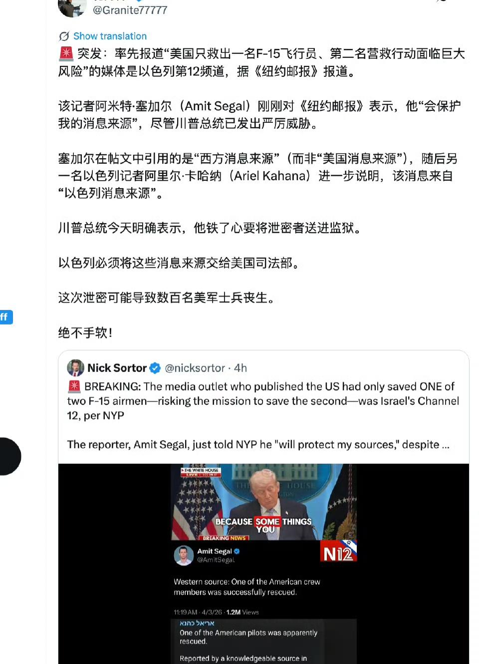关于泄密 《纽约邮报》等媒体称,率先曝光“美军只救出一名飞行员、第二名仍在境内存活”消息的,是以色列第12频道的记者阿米特·塞加尔(Amit Segal)。 这次泄密极其致命:伊朗最初以为只掉了一名飞行员,正是因为这份报道,德黑兰才意识到山里还躲着一个“大宝贝”,随即发出了巨额悬赏。 美军在随后的营救中被迫出动了155架次战机(包括4架轰炸机和64架战斗机),甚至在撤离时不得不炸毁两架陷入泥沙的MC-130J特种作战飞机。 美国总统特朗普今天在白宫新闻发布会上放狠话:“要么交出消息来源,要么去坐牢。” 这种关键时刻的泄密根本不是什么“言论自由”,而是实打实的“战时叛国”,是拿前线士兵的命搏眼球换流量。涉及国家安全和士兵生命的底线,绝不该有免死金牌。