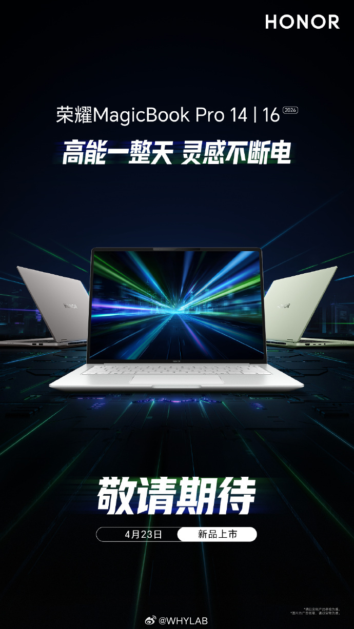 荣耀 WIN 游戏本也官宣了,4 月 23 日发布,同期还有 2026 款 MagicBook Pro 14、MagicBook Pro 16。新机来了