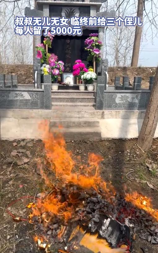 看哭了!男子生前无儿无女,在临终前,他拿出15000块钱分给三个侄儿,而侄子并没有白拿这笔钱,每年清明都会来到叔叔的坟前祭拜,一番话更是感动了全网。 15000 块钱,放在如今不算什么大钱,可能只是普通人一两个月的收入,应付日常开销就所剩无几。可对重庆一位无儿无女的孤老来说,这一万五,是他省吃俭用攒了一辈子的全部积蓄,是他人生最后、也是唯一的念想。 老人一生孤单,没有妻儿相伴,晚年全靠三个侄子时常照看。到了临终之际,他已经虚弱得说不出太多话,只是颤抖着枯瘦的手指,从枕头底下摸出一个陈旧的铁盒子。盒子里整整齐齐码着三沓钱,每一沓都是 5000 块,用皮筋紧紧捆着,钱币的边角都被岁月磨得发毛,每一分都藏着老人半生的节俭与不易。 按照常理,侄子并没有赡养和料理后事的法定义务,老人本无依无靠,走后或许只会落得无人问津的结局。可他心里比谁都明白,这辈子无儿无女,身后事只能托付给这三个侄子。他没有过多的言语,也没有郑重其事地交代,只是默默把钱递到三个侄子手中,这份举动里,是全部的信任,也是最后的托付。 三个侄子没有丝毫推辞,也没有嫌弃钱少,更没有觉得这是负担。他们稳稳接过叔叔的毕生积蓄,也默默接过了一份沉甸甸的责任。他们知道,这不是简单的钱财,是老人孤苦一生的寄托,是对亲情最后的期盼。 从老人入土为安的那天起,三个侄子就把祭拜叔叔当成了一辈子的事。每年清明,无论天气如何,不管工作多忙,他们都会雷打不动地赶往乡下的坟头。除草、添土、摆上祭品,认认真真烧纸祭拜,蹲在墓碑前,跟叔叔唠唠家常,说说生活里的琐事,就像老人还在时一样亲近。 乡下的坟地,若是两三年无人打理,很快就会杂草丛生,荒凉得看不出模样。很多有儿有女的人,百年后都未必能得到这般周全的照看,可这位无儿无女的老人,坟前却年年都有新培的黄土、燃尽的纸灰,从来不曾冷清过。 他们曾默默许下承诺,会年年祭拜,直到自己走不动的那一天。这句没有说出口的话,没有华丽的辞藻,却重逾千斤。这不是做给旁人看的场面事,而是发自内心的担当,是对亲情最朴素的坚守。 很多人看完都忍不住红了眼眶,大家感慨的不只是老人的孤苦与托付,更是三个侄子的知恩图报、信守承诺。老人用一生积蓄换来了身后的安稳,侄子们没有白拿一分钱,用年年岁岁的祭拜,兑现了无声的约定。 世人总说,人这辈子最值钱的是钱财、是物质,可这位老人用一生告诉我们,真正的体面从不是活着时拥有多少财富,而是离世后,还有人真心惦记、年年看望。无儿无女从不是最可怕的孤苦,有人真心相待、有人铭记牵挂,才是人生最大的圆满。 三个侄子用最平凡的举动,诠释了什么是亲情,什么是担当。他们没有惊天动地的壮举,只是用一年又一年的坚守,告慰老人的在天之灵。这份双向奔赴的亲情,没有血缘之外的算计,只有真心换真心,足以温暖无数人,也让我们明白,世间最珍贵的,从来都是这份沉甸甸的善意与坚守。