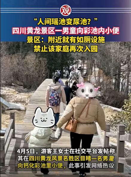 四川黄龙景区,一个男童向五彩池内小便。游客拍下视频传到网上,炸了锅。有网友说,这是“人间瑶池变尿池”,太恶心了。也有人替孩子说话,几岁的小孩,憋不住了,不是故意的。 景区回应:附近就有厕所,该家庭已被禁止再次入园。 我琢磨着,几岁的孩子,憋不住,能理解。但家长在身边,为什么不提前带去厕所?景区说附近就有设施,说明不是找不到,是没当回事。孩子不懂事,大人也不懂事? 这事闹这么大,不是因为一泡尿毁了景点,是大家觉得,你毁的不是一个池子,是所有人的体验。你不守规矩,别人就得看你的尿。这谁受得了? 不过话说回来,骂孩子没用,该骂的是家长。孩子小不懂,大人也不懂?出门玩,提前上个厕所,这是基本常识。这次是尿池子,下次是什么? 景区禁入,这处罚不重,但该。不是跟一个孩子过不去,是告诉所有家长:管好自己的孩子,别让他成为别人眼里的“熊孩子”。孩子的错,家长买单。这单,买得冤不冤?不冤。谁让你没看住。