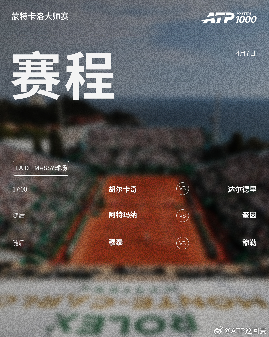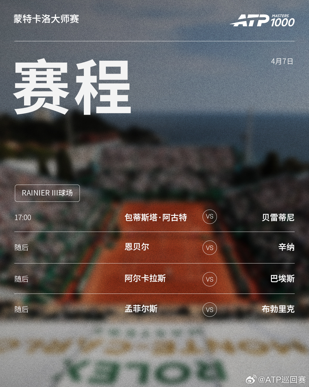 ATP1000 蒙特卡洛大师赛周二赛程如下(均为北京时间)👀