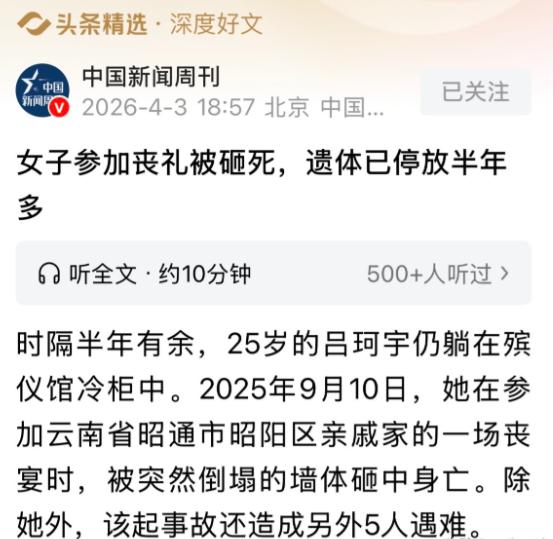 云南昭通,一25岁女子参加丧礼,她和另外5人,被突然倒塌的墙砸死,几天后,赔偿方案下来了,每人赔14.6万,丧主家出8万,上面出6.6万,要求立即火化遗体安葬。其他5家都接受了,只有女子母亲说啥都不同意,她不认为这是场意外,坚决要求给个说法,导致女子遗体已停放半年多,还没入土为安。 截至2026年4月,云南昭通昭阳区一位25岁女子的遗体,已经在殡仪馆冷柜里停放了整整7个月。她本该入土为安,却因为母亲的坚持,迟迟没能落叶归根,而这一切的起因,都是一场发生在丧礼上的意外,一场让6个家庭破碎的悲剧。 这场悲剧发生在2025年9月10日,女子前往亲戚家参加丧礼,丧主家摆了上百桌宴席,地方不够用,便借用了堂兄弟家的院坝。当天傍晚6点左右,院坝紧邻的一道围墙突然轰然倒塌,正在吃席的女子和另外5人,来不及反应就被砸在下面。 救护车赶到现场时,6人已经没有了生命体征,其中就包括这位25岁的女子,还有她53岁的姑姑。女子的父亲连夜从外地赶往现场,母亲则辗转多趟交通工具赶来,见到女儿遗体时,整个人几乎崩溃,连站都站不稳。 事故发生后,当地多部门迅速介入,还成立了联合调查组,没过几天就出台了赔偿方案。方案明确,每位遇难者赔偿14.6万元,其中丧主家承担8万元,相关部门出资6.6万元,唯一的条件就是,家属必须立即火化遗体,尽快安葬。 面对这个赔偿方案,另外5户遇难者家属经过考虑后,都选择了接受,很快就办理了火化和安葬手续,慢慢走出悲痛。只有这位25岁女子的母亲,无论怎么劝说,都坚决不签字,一口拒绝了这份赔偿,也不同意火化女儿的遗体。 女子母亲不认可这起事故被定性为“意外”,她发现,倒塌的围墙原本只有五六十公分高,是后期被擅自加高到3米,而且没有构造柱,也没有钢筋,本身就存在严重的安全隐患,根本不是单纯的意外那么简单。 更让她无法接受的是,丧主家操办丧礼时,私自搭建了大面积篷布,当时还下着雨,篷布积水加上瞬时风力,才导致围墙超过承受力倒塌。她认为,除了丧主家和墙体所有人,相关监管部门也有责任,不该只定为意外。 女子母亲的诉求很简单,不求多要赔偿,只求相关部门能出具一份正式的调查报告,查明事故的真正原因,划分清楚各方责任,给她和死去的女儿一个明确的说法。可这个诉求,始终没有得到明确回应,双方的僵持一直持续着。 这半年多来,女子母亲一直瞒着家里的老人,谎称女儿外出打工,不敢告诉他们真相。老人常常问起女儿的消息,盼着她回家,每当这时,她都要强装镇定,背地里却偷偷抹泪,整理女儿房间时,连一件东西都舍不得扔。 春节前,相关部门再次提出了同样的赔偿方案,明确表示不会出具调查报告,认定这只是意外,不涉及任何部门责任,但女子母亲依旧拒绝接受。如今,女子的遗体还在殡仪馆停放着,而这场因围墙倒塌引发的纠纷,仍没有解决。 对此,你们有什么看法,欢迎评论留言~