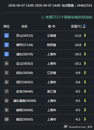 【气温波动】今天因为冷空气或阴雨影响,云南西北部、陕西南部、江浙沪等地出现明显降温。云南贡山降11.6℃、陕西佛坪降10.8℃、上海浦东降10.5℃、江苏启东降9.9℃、浙江安吉降9.5℃,为各自省市14时降温最强站点。