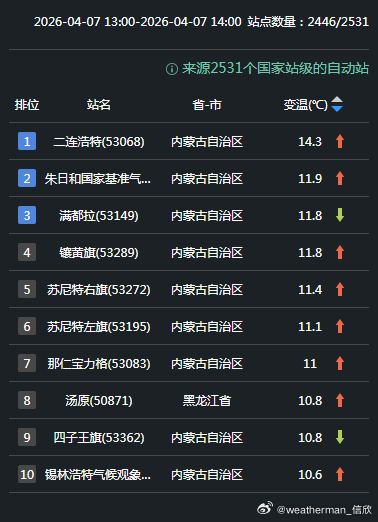 今天在冷空气过后,且晴朗有光照加热,内蒙古和黑龙江吉林多地升温迅猛。内蒙古二连浩特升14.3℃、黑龙江汤原升10.8℃、吉林双辽升10.3℃,为各省区14时升温最强站点。近期气温偏低的情况明显好转。