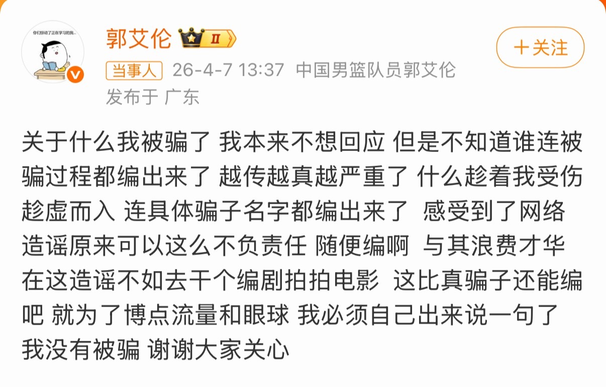 郭艾伦否认被骗 真相比流量慢一步,但谣言从来不需要刹车。如果真是诈骗,这种级别的金额,不可能一点动静没有。如果不是诈骗,那前面那些“细节丰富”的说法,到底是谁在编?最近是怎么了,动辄都是上千万,前段时间南京一汽车圈的老板,也说老婆瞒着他在外面欠了3000多万。现在赚钱这么容易吗?