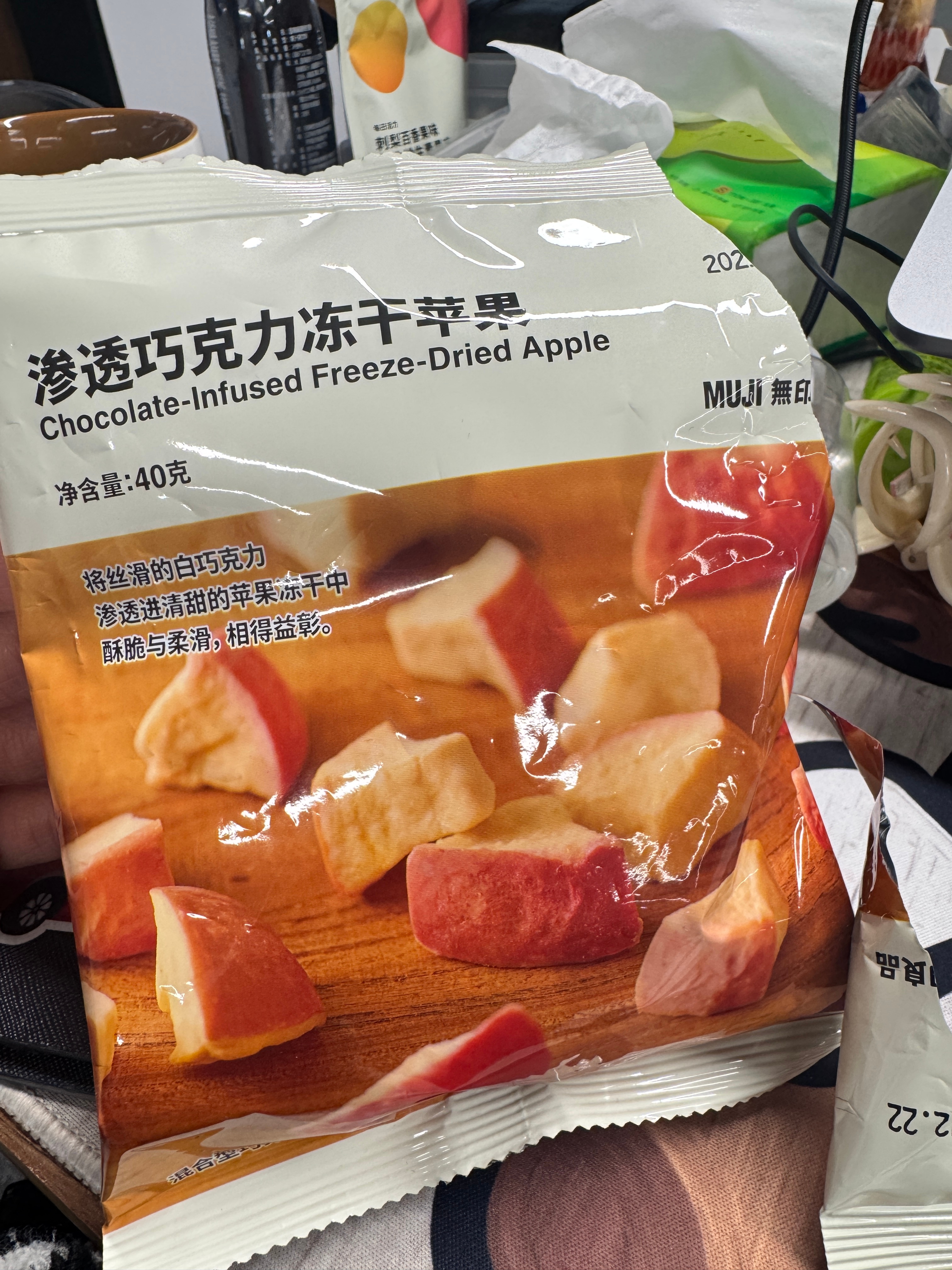 昨天逛无印良品,随手拿了一袋零食,扫了眼包装写着“苹果冻干”就直接扔进框里了。