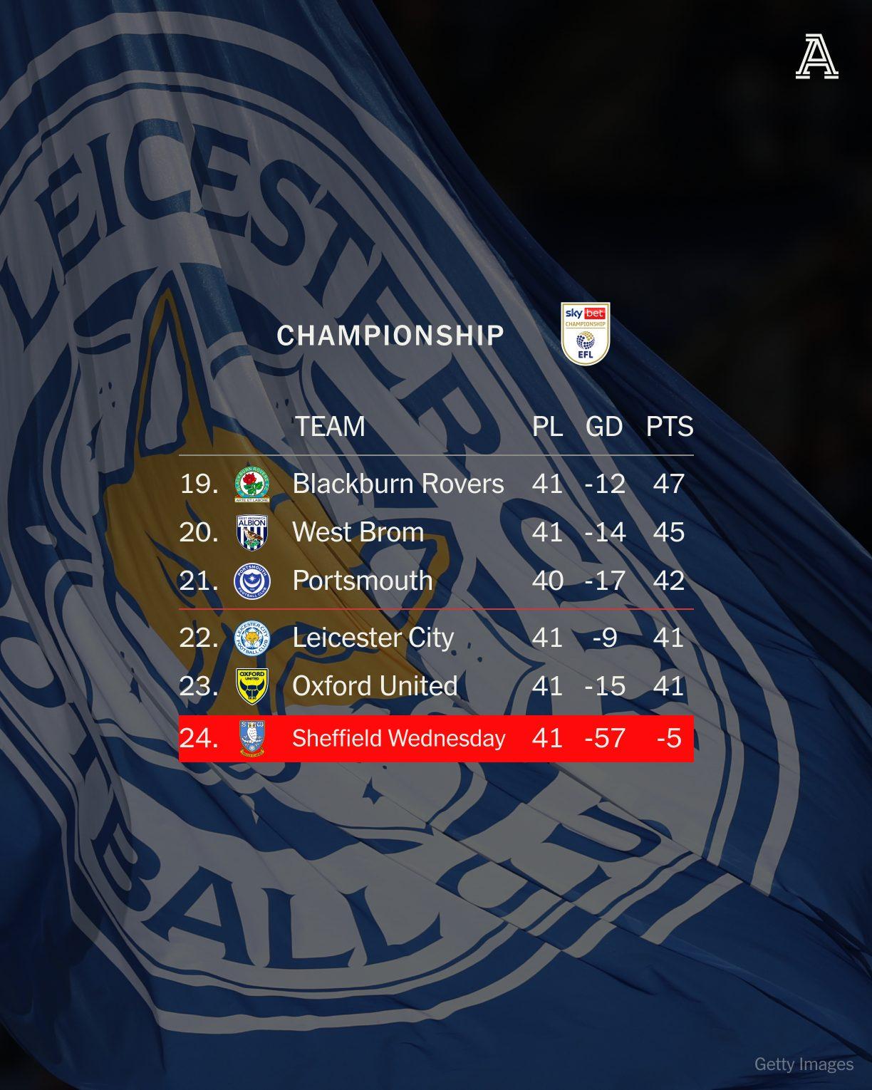 【莱斯特城丢掉必拿的三分】英冠第41轮,莱斯特城客场1-1战平排名榜尾、本赛季联赛仅胜1场的谢周三,丢掉了保级路上必须拿下的三分! 本场比赛,莱斯特城狂轰24脚射门(谢周三仅射6脚),但仅仅由乔丹·阿尤在第84分钟扳平比分。如果拿下比赛,莱斯特城将积43分、直接跳出降级区。 目前在积分榜(图2)上,朴茨茅斯、莱斯特城和牛津联牢牢地纠缠在一起,联赛还剩五轮,一场胜利就能立马改变局势。
