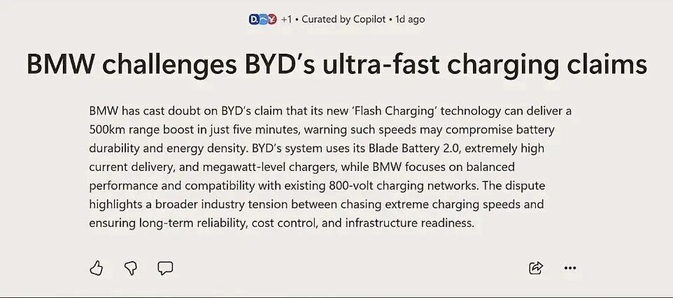 【宝马:比亚迪闪充伤电池!被比亚迪远远甩开,只能靠嘴硬维持体面!】 近日,宝马电池生产负责人在接受澳洲媒体采访时谈到比亚迪刚发布的闪充技术,大意就是:超高充电速度看起来很惊艳,但背后一定存在代价,尤其是在耐用性、续航、热管理和长期可靠性这些方面,不可能只把充电速度拉满,别的性能却完全不受影响。 据悉,宝马现在的800V平台,从10%充到80%还要21分钟,被比亚迪甩开一大截。此前比亚迪董事长王传福在发布会上表示,比亚迪第二代刀片电池及闪充技术不会影响电池的寿命。【来自懂车帝车友圈】