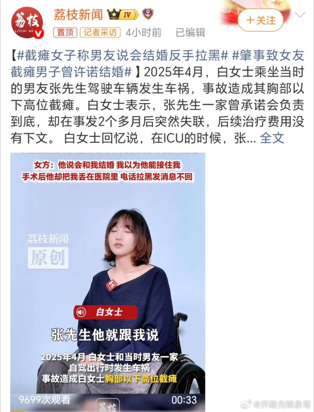 截瘫女子称男友说会结婚反手拉黑这种男人就是想白嫖,真的是大难临头各自飞,马扁她进去手术,他好脚底抹油,赶紧溜啊?漂亮话说一堆,就不能直接公开一下这个渣男吗?让其她女孩也避避坑啊?