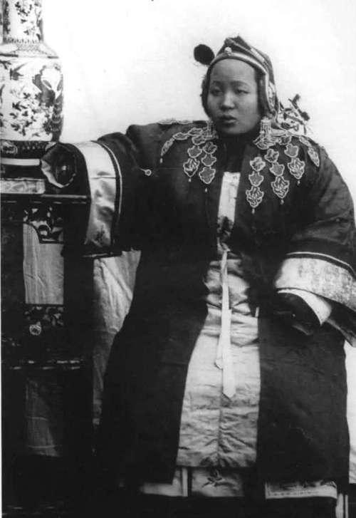 摄影术刚传入中国时,敢拍照的中国女性少之又少,而这张照片里的满族贵妇,就是最早的一批模特。清末旗人女性因为地位高、思想开放,成为了中国最早接触摄影的群体。 左侧的硬木家具是官宦人家常用的条案,雕花工艺精湛,材质为红木、紫檀等硬木,条案上的大型瓷瓶,是清代景德镇精品,瓶身绘有花鸟纹饰,照片拍摄于照相馆的标准布景内,倚坐扶案是清末照相馆的经典摆拍姿势——因早期摄影曝光时间长,需要保持长时间不动,扶靠家具能避免晃动。