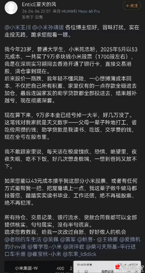今天看到一个帖子,忠实米粉大学生买小米股票,浮亏几万心态崩了!然后向小米高管“求救”。