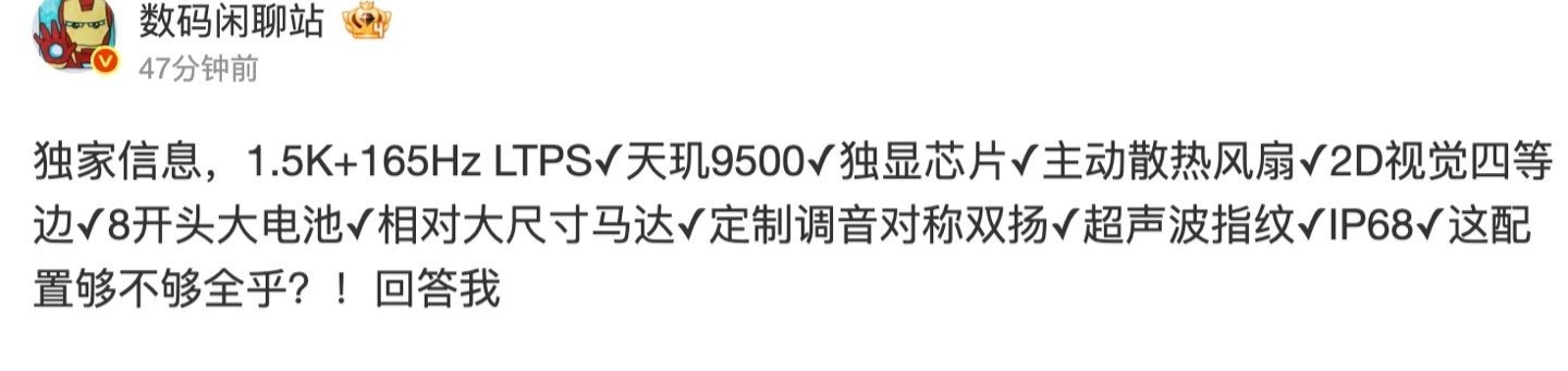 博主 数码闲聊站 此前爆料称,某厂天玑 9500 新机将搭载 1.5K 165Hz LTPS 屏幕,具备独显芯片、主动散热风扇,屏幕采用 2D 视觉四等边设计,具备 8 开头大电池、相对大尺寸马达、定制调音对称双扬声器以及超声波指纹,还有 IP68 防尘防水。