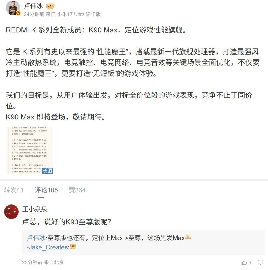 【小米卢伟冰:REDMI K90 至尊版也还有,定位上 Max > 至尊】