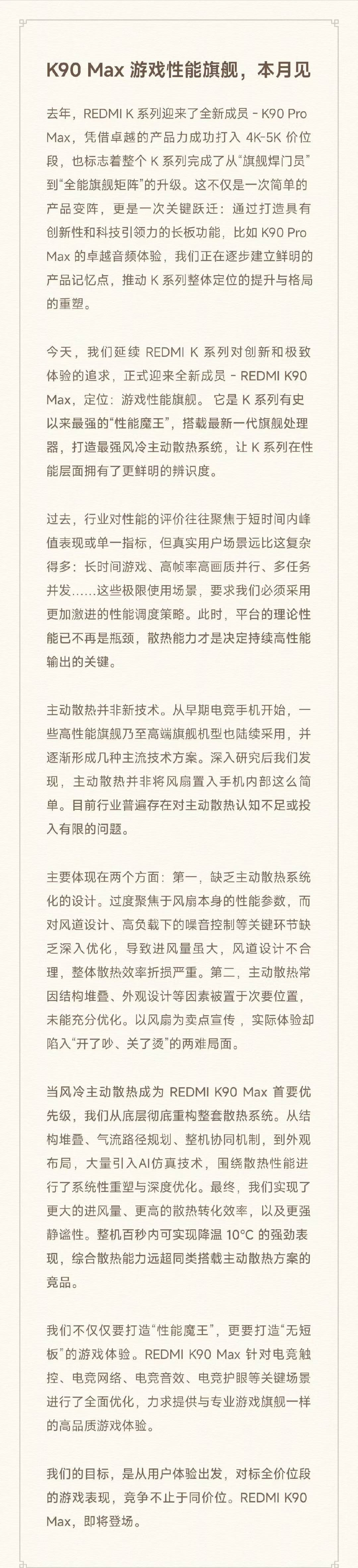 我们的目标是,从用户体验出发,对标全价位段的游戏表现,竞争不止于同价位。K90 Max 即将登场,敬请期待。
