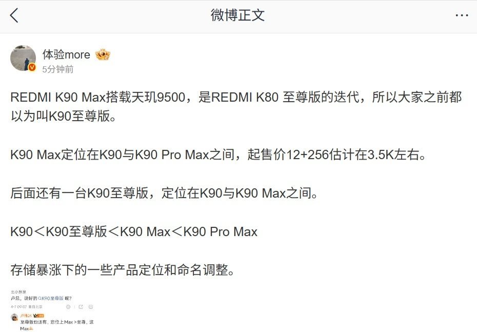卢伟冰还在微博中透露,REDMI K90 至尊版也还有,定位上 Max > 至尊,这场先发 Max。