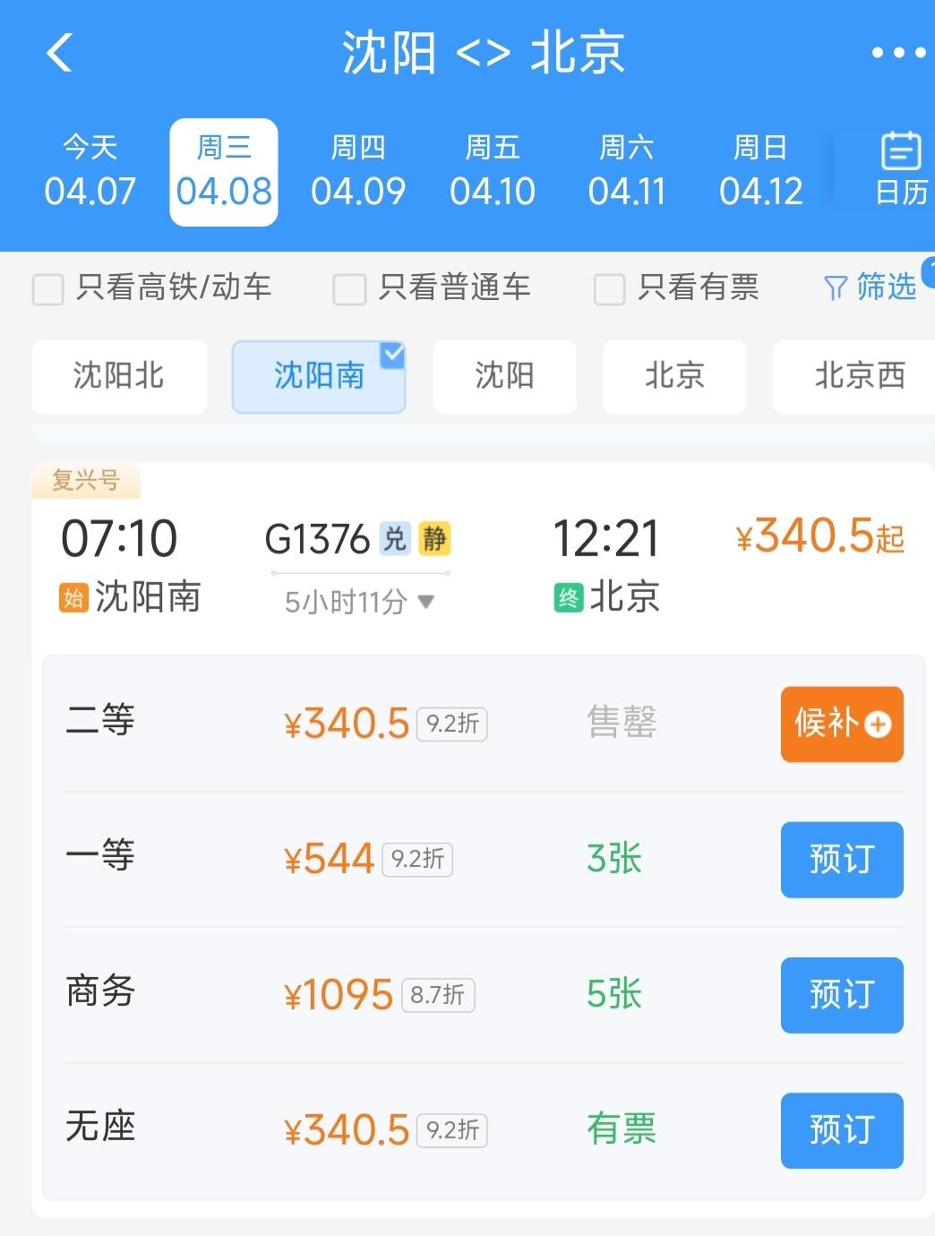 经过多年的不懈努力沈阳南站终于繁华起来了。来这里坐高铁的旅客真的是越来越多,特别是乘坐G1376次列车的时候更是让人深有感触。 仔细观察这趟高铁列车是从沈阳南站始发,最终直达北京站。即便这趟列车不经过沈阳站或者沈阳北站,可是上座率依然很高,不知不觉8日二等座已经完全售罄,一等座与商务座所剩无几,在平常工作日能有这样的表现让人叹为观止。 看到这里不禁感慨经过多年的不懈努力沈阳南站终于举办独当一面的实力,今后可以极大的缓解沈阳北站的交通压力,仔细想想让人倍感欣慰。