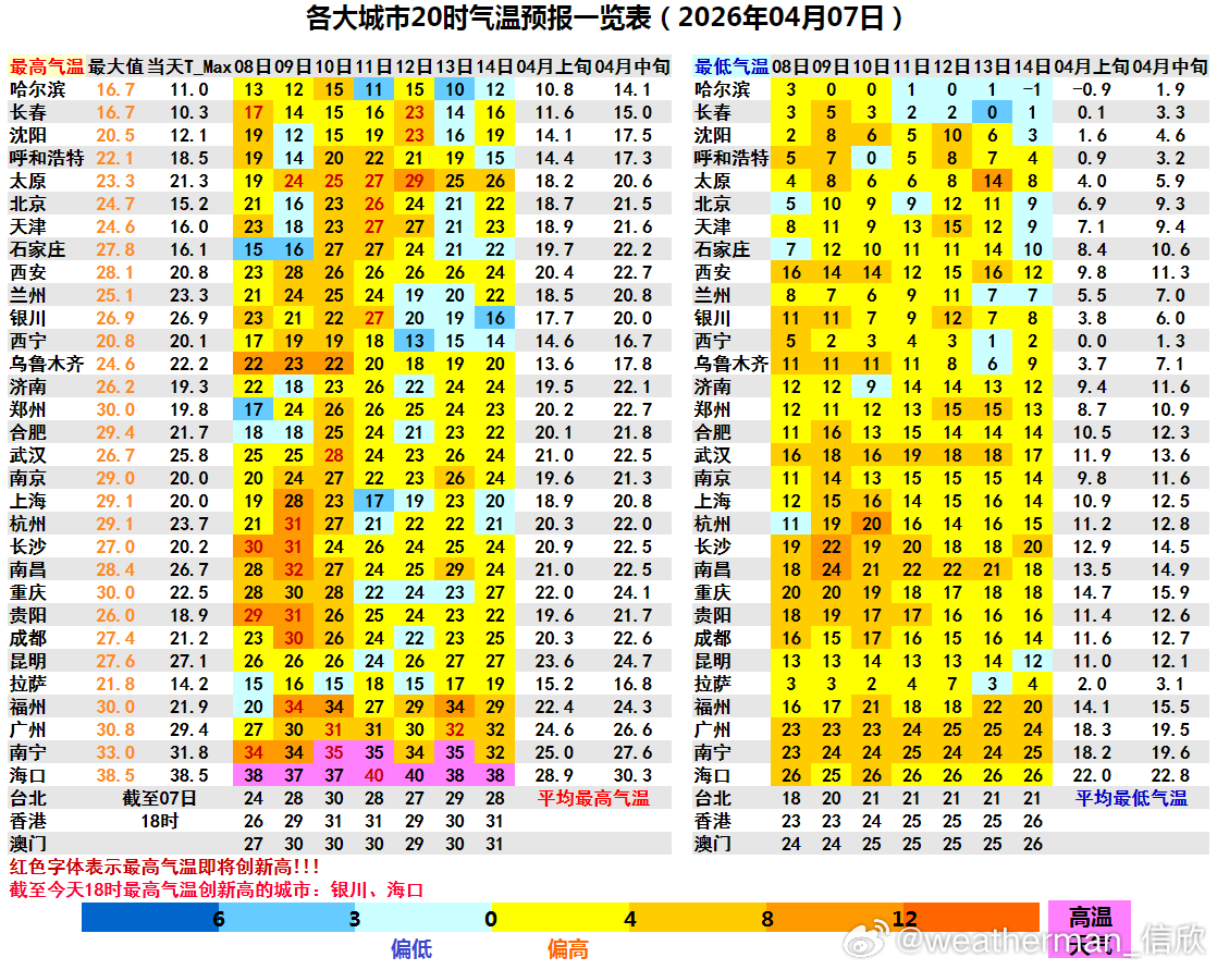 【气温波动&创新高】今天最高气温:海口38.5℃、银川26.9℃,创出今年新高。未来还会看到气温创新高,但大多不是一路高歌猛进,而是波动中,曲折向上。海口未来在副热带高压影响下,持续35℃以上高温。11-12日最高可达40℃,将创当地4月中旬最高纪录和最早40℃日纪录。