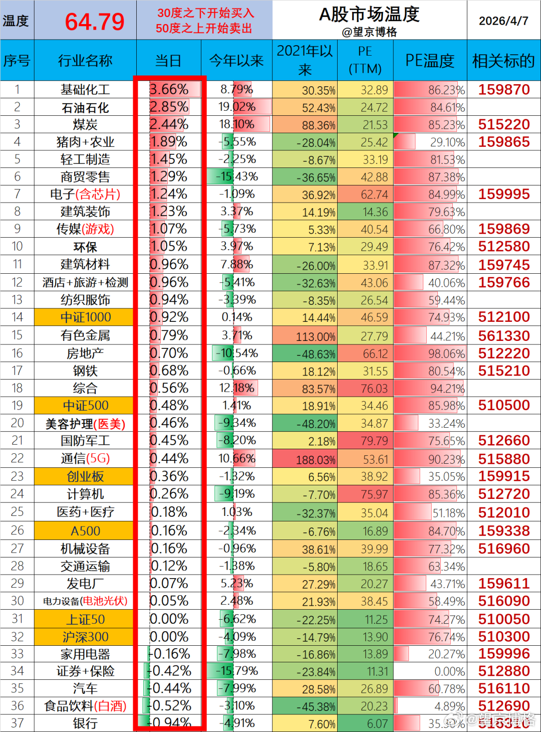 聊几句行情和感受:A股市场等待抄底时机(1)ETF实盘账户,今天盈利+0.2万;(2)某宝实盘账户,今天盈利+1.3万;(3)两个账户,合计预期盈利+1.5万,预估盈亏比例+0.19%。博格今年一月份的时候最高浮盈+70万,现在浮亏-14万,里外里回撤了84万,真的很难受。现在唯有一个目标,期望账户收益早日创新高了~今日温度:A股今天64.79度,相比上一个交易日上升+0.50度;港股今天休市~欢迎留言!也感谢大家的点赞与点爱心~PS:4月11日望京博格第一次大户私享会在上海举办,有私域的朋友赶紧去看一下,就剩下几个名额了。