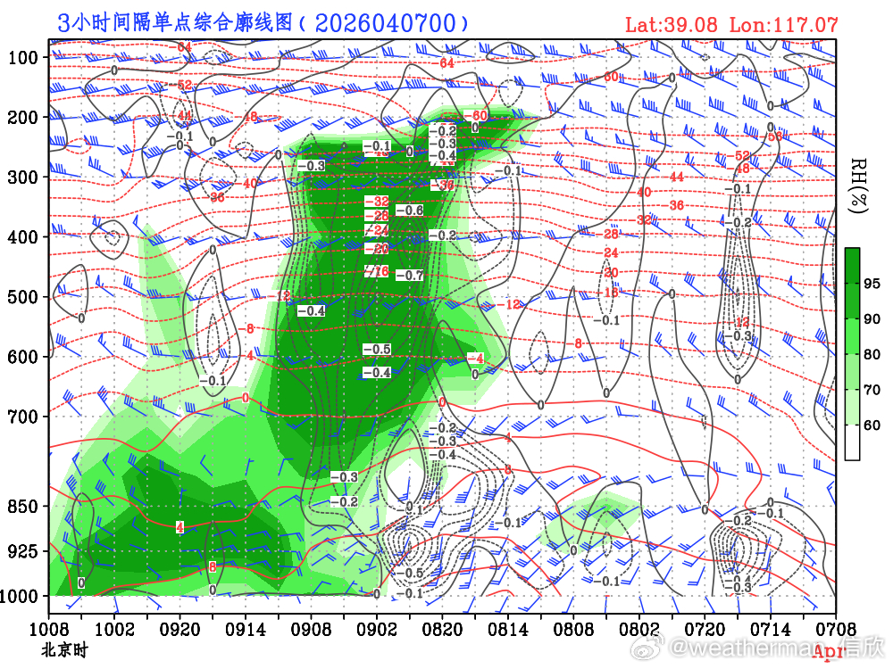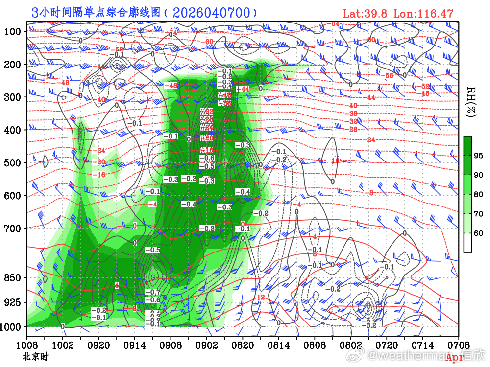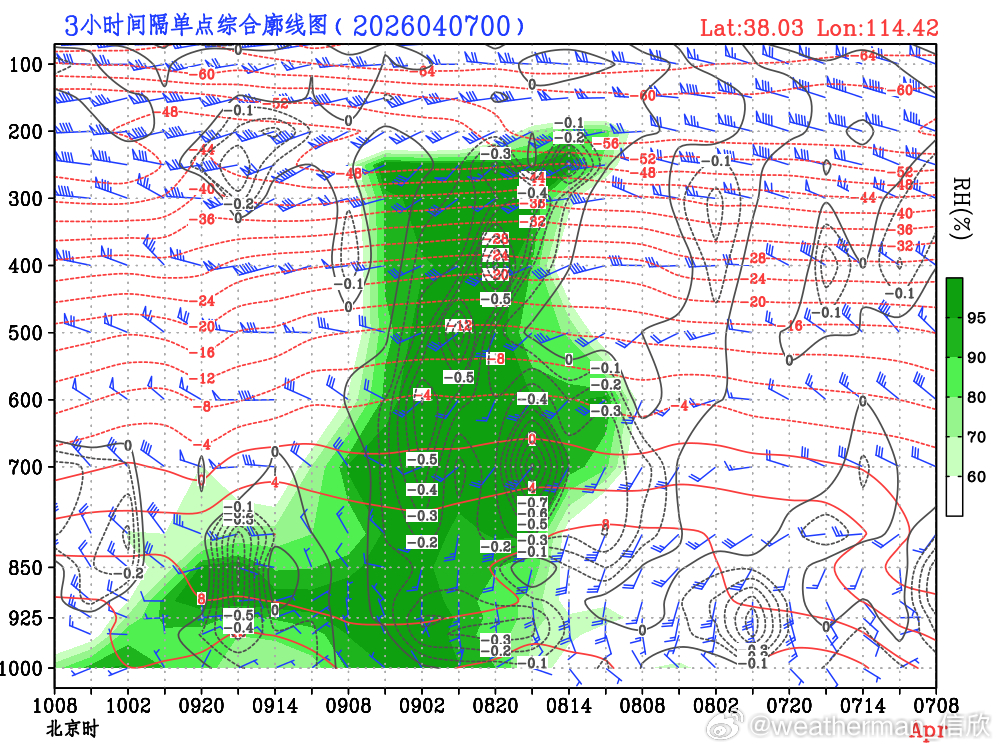 【京津冀降水分析】目前预报看,4月8日晚-9日,京津冀将普遍出现降雨。总体雨量可能达到小雨-中雨级别。高空有槽东移,低空先有南风之后有东风回流。总体的水汽动力条件配合较好,降水必定有,就看能不能到中雨的级别。图1为数值预报的对比,图2-4为北京、天津、石家庄的综合廓线图。