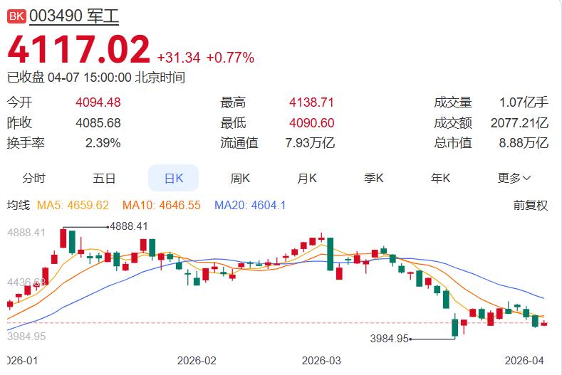 4月7日军工板块上涨0.77%,资金净流出超10亿元,涨停股主要有航天电器10.0%、中航光电5.9%、甘化科工2.1%、天秦装备1.8%、菲利华1.4%、捷强装备0.9%、长城军工0.8%、国科军工0.6%、电科数字0.5%、北方长龙0.4%,无跌停板,跌幅较大的有航发动力-5%、广联航空-5%、国博电子-4.5%、*ST万方-5.2%、西测测试-3.7%、兴图新科-3.4%、火炬电子-3.2%、睿创微纳-3%、中国卫星-2.5%、洪都航空-2%。航天电器因224G高速连接器受益国产算力建设及中东局势催化的军贸需求而涨停。 今日板块延续探底走势,成交额续创年内新低,资金观望情绪浓厚。航天电器逆势涨停主要受国产算力与军贸出口双逻辑驱动,属个股结构性机会。近期天龙三号火箭首飞失利、子公司采购资格暂停等事件对板块情绪形成压制。后市看,板块底部特征已较为显著,但企稳仍需等待市场情绪改善与增量资金回流,建议保持耐心。