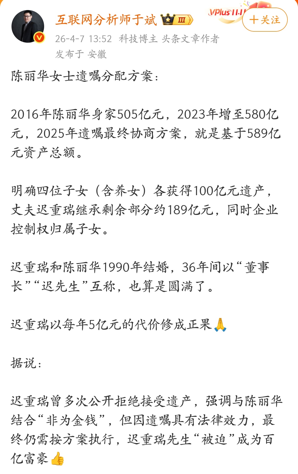 迟重瑞曾多次公开拒绝接受遗产,这点很难得。