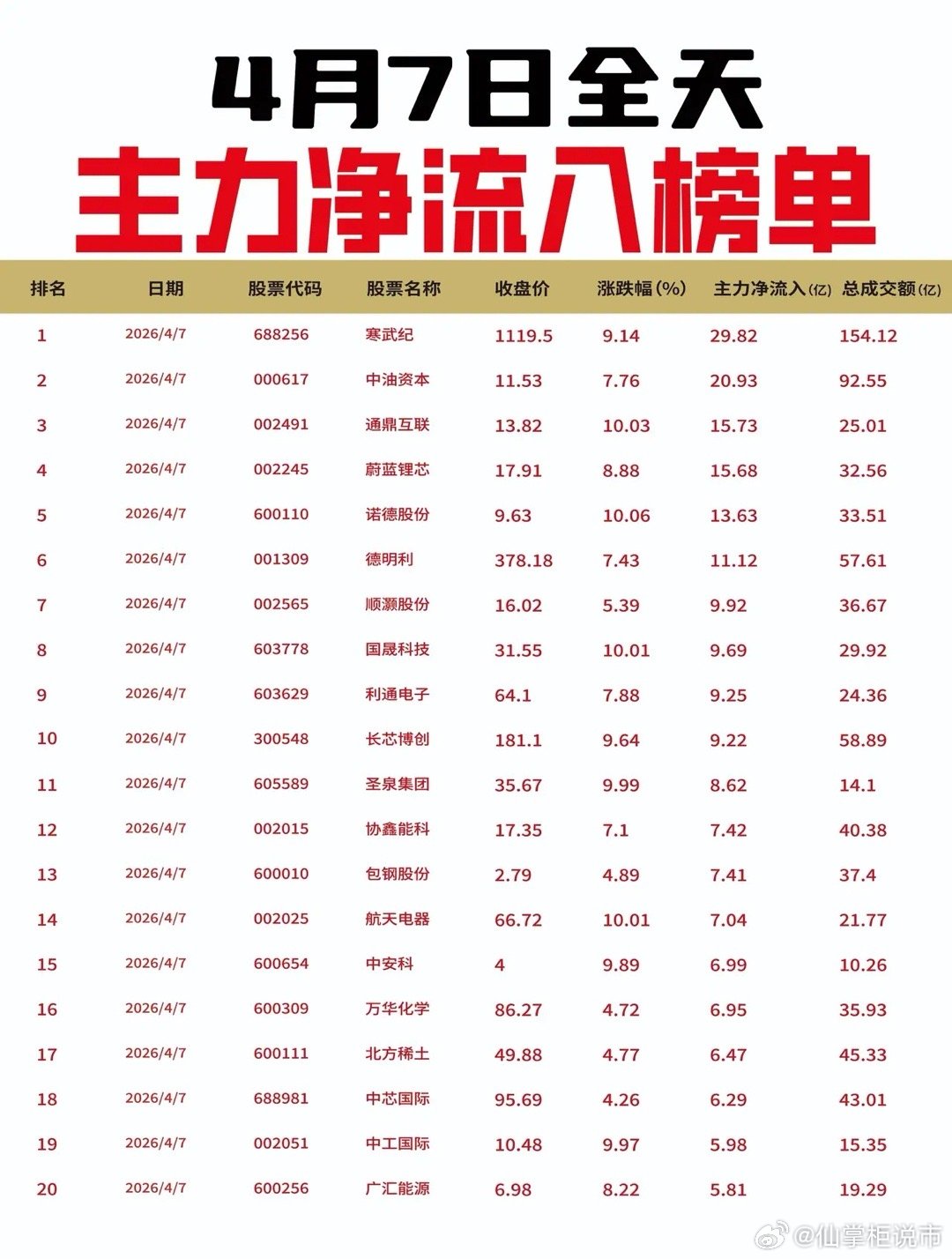 【4月7日全天主力净流入流出榜单出炉🔥】: 今日全天主力资金聚焦AI芯片及金融科技方向。寒武纪以29.82亿元净流入居首,中油资本、通鼎互联、蔚蓝锂芯、诺德股份等获资金抢筹;德明利、国晟科技、长芯博创等科技股同步活跃。流出榜上,光模块板块承压,天孚通信遭13.63亿元抛售,阳光电源、兆易创新、中天科技、东山精密等资金流出显著。市场风格分化,资金从光模块及新能源龙头切换至AI芯片及低位科技方向。
