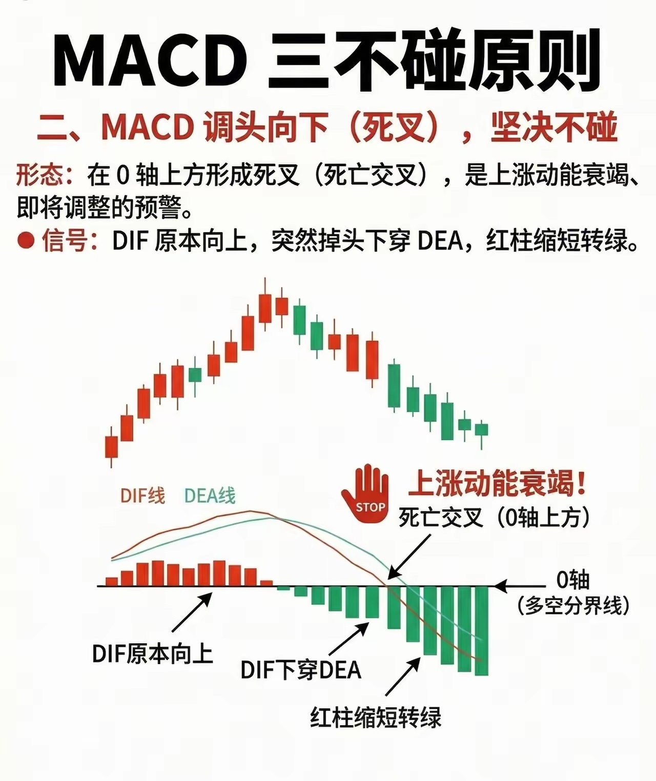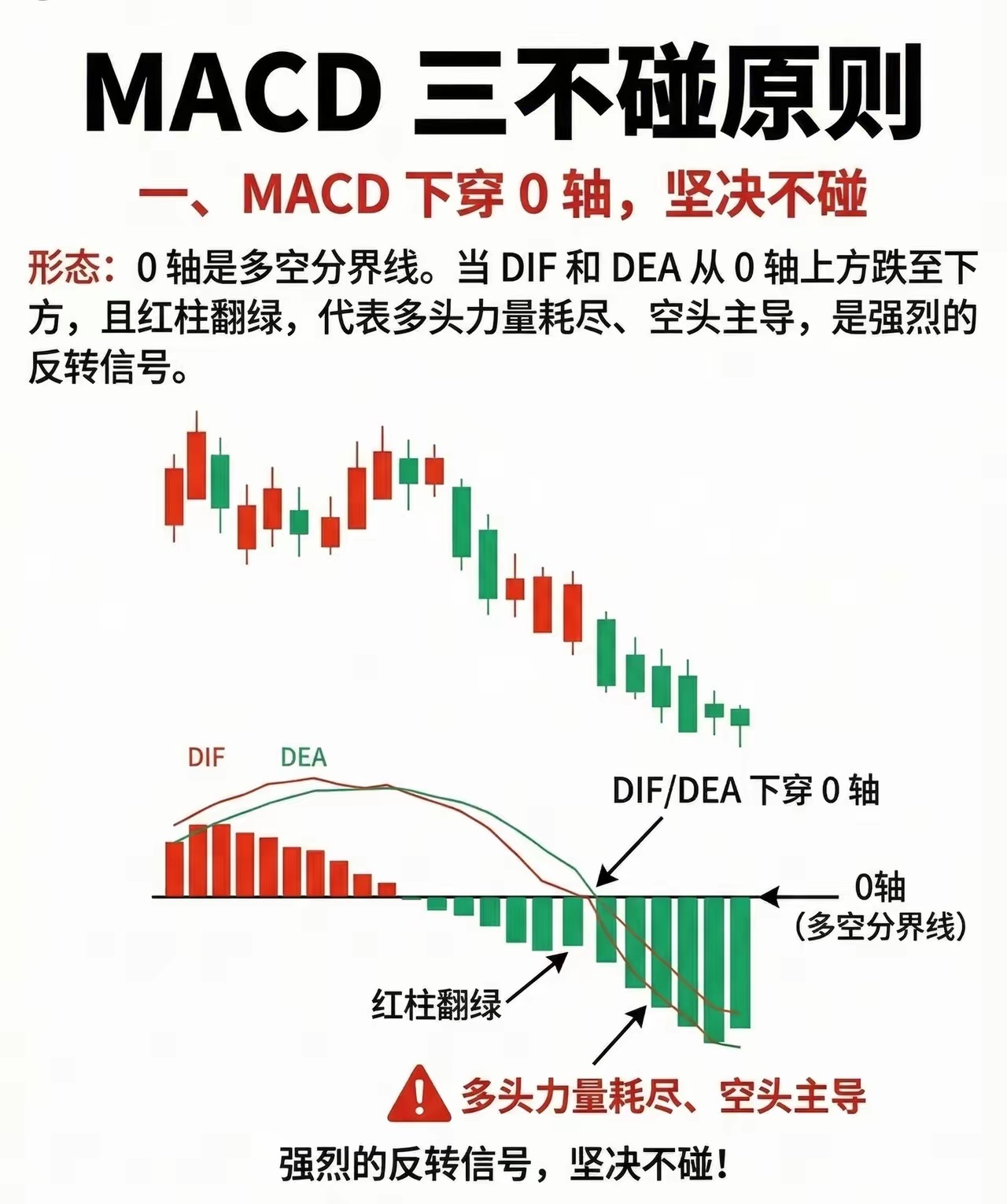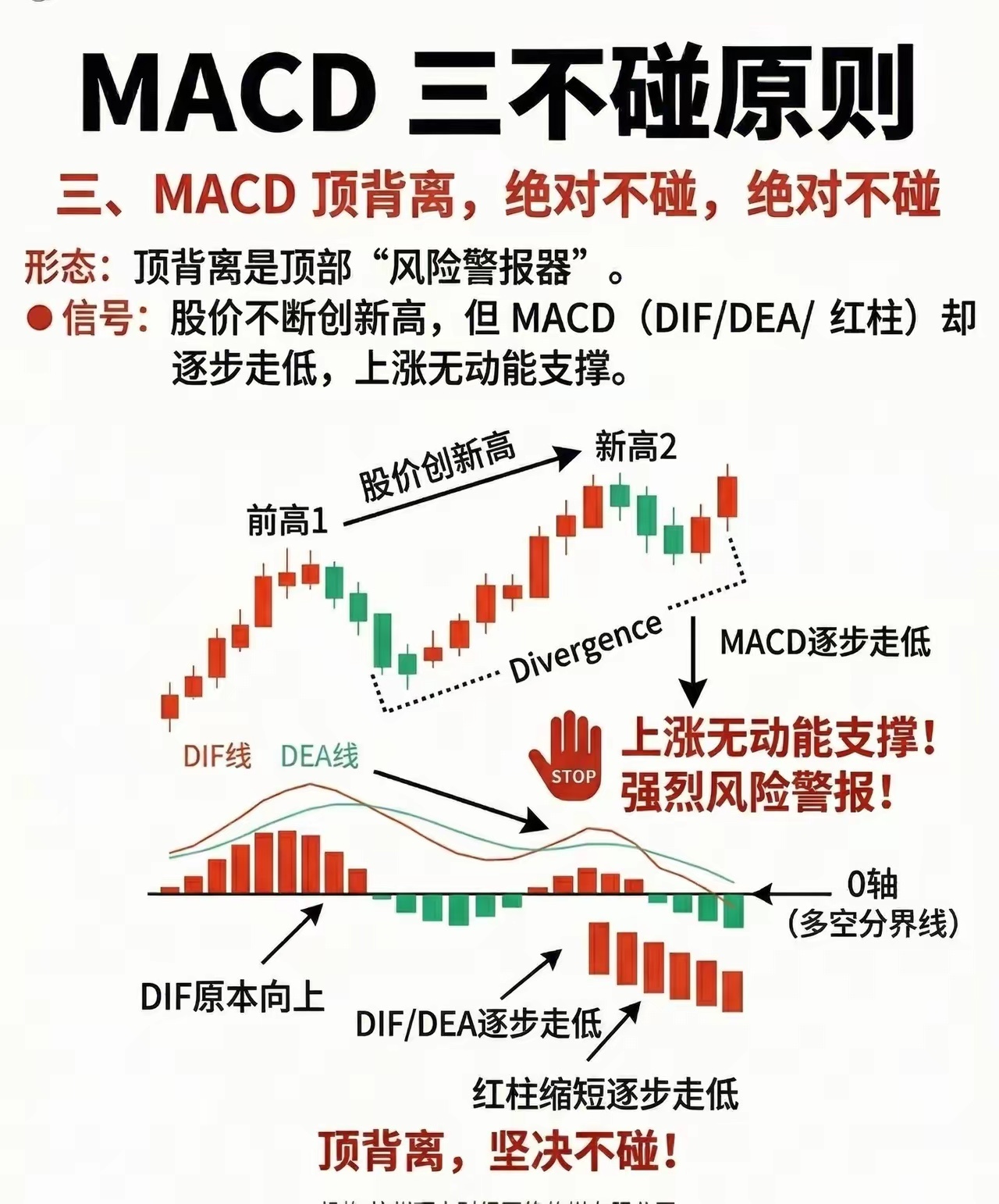 避开MACD三大“雷区”,散户炒股少走弯路在技术分析的世界里,MACD是无数股民判断趋势的“指南针”,但用不好反而会踩中陷阱。今天就拆解市场流传的MACD三不碰原则,帮你精准规避风险,守住本金。第一,MACD下穿0轴坚决不碰。0轴是多空力量的分水岭,当DIF和DEA从0轴上方跌落至下方,同时MACD红柱翻绿,意味着多头动能彻底耗尽,空头开始主导行情,这是强烈的下跌反转信号。此时入场,大概率会被裹挟进下跌浪潮,深套其中。第二,MACD在0轴上方形成死叉坚决不碰。死叉是上涨动能衰竭的预警灯,当原本向上的DIF突然掉头下穿DEA,红柱同步缩短转绿,说明短期上涨动力已经枯竭,股价即将进入调整周期。这种信号出现在高位时,往往是主力资金出货的前兆,盲目跟进只会沦为接盘侠。第三,MACD顶背离绝对不碰。顶背离是顶部最危险的“警报器”,当股价不断刷新新高,而MACD的DIF、DEA线及红柱却逐级走低,意味着股价上涨已经失去动能支撑,是典型的“虚涨”信号。历史经验反复证明,顶背离出现后,股价大概率会迎来深度回调,此时再追高无异于火中取栗。当然,技术指标并非万能,MACD信号也要结合成交量、基本面等综合判断。但牢记这三条原则,能帮你过滤掉大部分高风险交易,在波动的市场中多一份从容。风险提示:本文仅为技术知识科普,不构成任何投资建议,股市有风险,入市需谨慎。