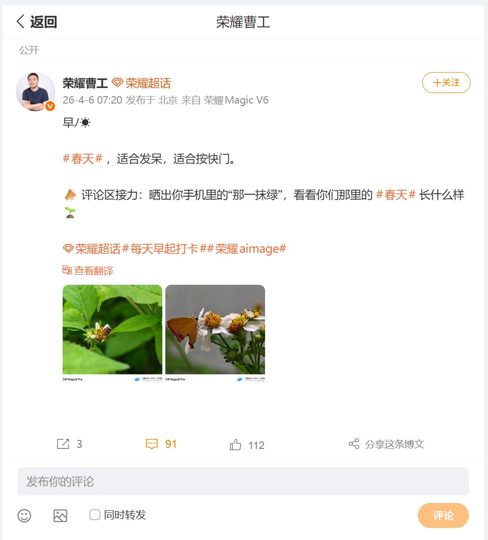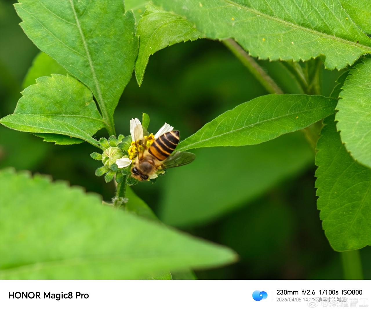 小伙伴们记忆里面的春天是什么样子的呢?不妨利用手机随手拍的方式,将美好的瞬间留在照片中,闲暇的时候重温心情也蛮愉悦,刚刚看到荣耀研发工程师曹工,分享的蜜蜂采蜜、蝴蝶手机花粉的照片,荣耀Magic8 Pro的影像能力,长焦搭配大光圈,成像效果蛮好 畅聊数码新品 数码资讯