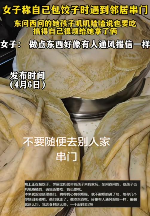 为什么有的人就喜欢饭点串门呢? 广东,一女子称晚上自己包饺子时遇到邻居串门,东问西问的邻居,叽叽喳喳要吃的娃,搞得女子很烦躁。最后拿了俩个给他们,打发走了。 老辈常说,饭点不扰人,不空手上门,不主动要吃的。到别人做饭吃饭的点还赖着不走,本身就很失礼,更别说还带着孩子叽叽喳喳要吃的,本质就是没边界、爱占便宜。 邻居之间送吃是有,但是主打一个你情我愿,礼尚往来。而不是主动开口要,饭点还赖人家家里。 本来打工人就这么累了,好不容易有点时间,做点自己喜欢吃的东西,本想美美享受宁静舒适的氛围。结果他们来了,叽叽喳喳,问东问西,搁谁谁都不爽,感觉被监控似的。 女子被道德绑架式索要,心里肯定不舒服,完全理解。但是不舍得给就不要给,给了就不要抱怨。自己这里三盘饺子,就给人家俩个,也就4块。这样一发视频,反而显得自己没格局了。 但最该被批评的,永远是那个不懂看人脸色、饭点上门、带着孩子讨要食物的人。规矩、礼貌、边界感,从来都不该让被打扰的人来买单。 你平时遇到这种没边界的人,一般是怎么应付的?