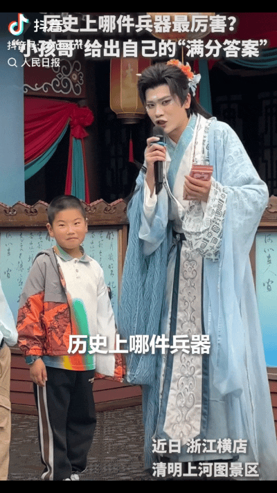 “万万没想到!”近日,浙江横店,主持人和观众互动时对一男孩提问:“历史上哪件兵器,光听名字就很厉害?”台下立即有游客说:“方天画戟!”不料,这位男孩的回答,直接让全场愣住,网友:这才是满分答案! 视频中,景区互动环节,主持人挑中了一男孩和他互动,主持人笑着问:“历史上哪件兵器,光听名字就很厉害?” 话音未落,台下有一男游客就脱口喊出:“方天画戟!” “方天画戟?”可这个答案是对的吗?主持人并没有给出回复。 他还是想听男孩怎么回答。 于是就又问:“你有想到吗?” 让人没想到的是,男孩似乎早有答案,自信的说:“东风-5C!” 一下子,全场安静一秒,之后一片掌声响起来。 看到这儿,很多人可能会心一笑。咱们这些成年人的“老脑子”,早被各种武侠小说和古装剧给框住了,一提兵器,满脑子都是刀枪剑戟、斧钺钩叉。可人家“小孩哥”压根没按套路出牌,他的脑子里装的,是大国重器。 是啊!东风-5C,打击覆盖全球,有谁能说它不厉害! 说实话,在等男孩说答案的时候,我也和大家一样,想了很多那种古代兵器,没想到会是这个答案,的确让人无力反驳,原来在这个小男孩心里,他太清楚什么是真正的“厉害”了。 这段视频被发到网上,男孩火了,网友们纷纷为其点赞。 有网友说:“东风5c是历史上最厉害的兵器,小孩哥回答正确。” 也有网友说:“新脑子和我们这些老脑子就是不一样。” 不得不说,这个“小孩哥”的这次满分答案,一下子戳中了中国人的心巴——不管你脑子里想的是什么神兵利器,都不如咱自家的“东风”来得让人踏实。 这回得给咱们的下一代点个大大的赞!就冲这眼界和格局,咱们的未来,稳了!