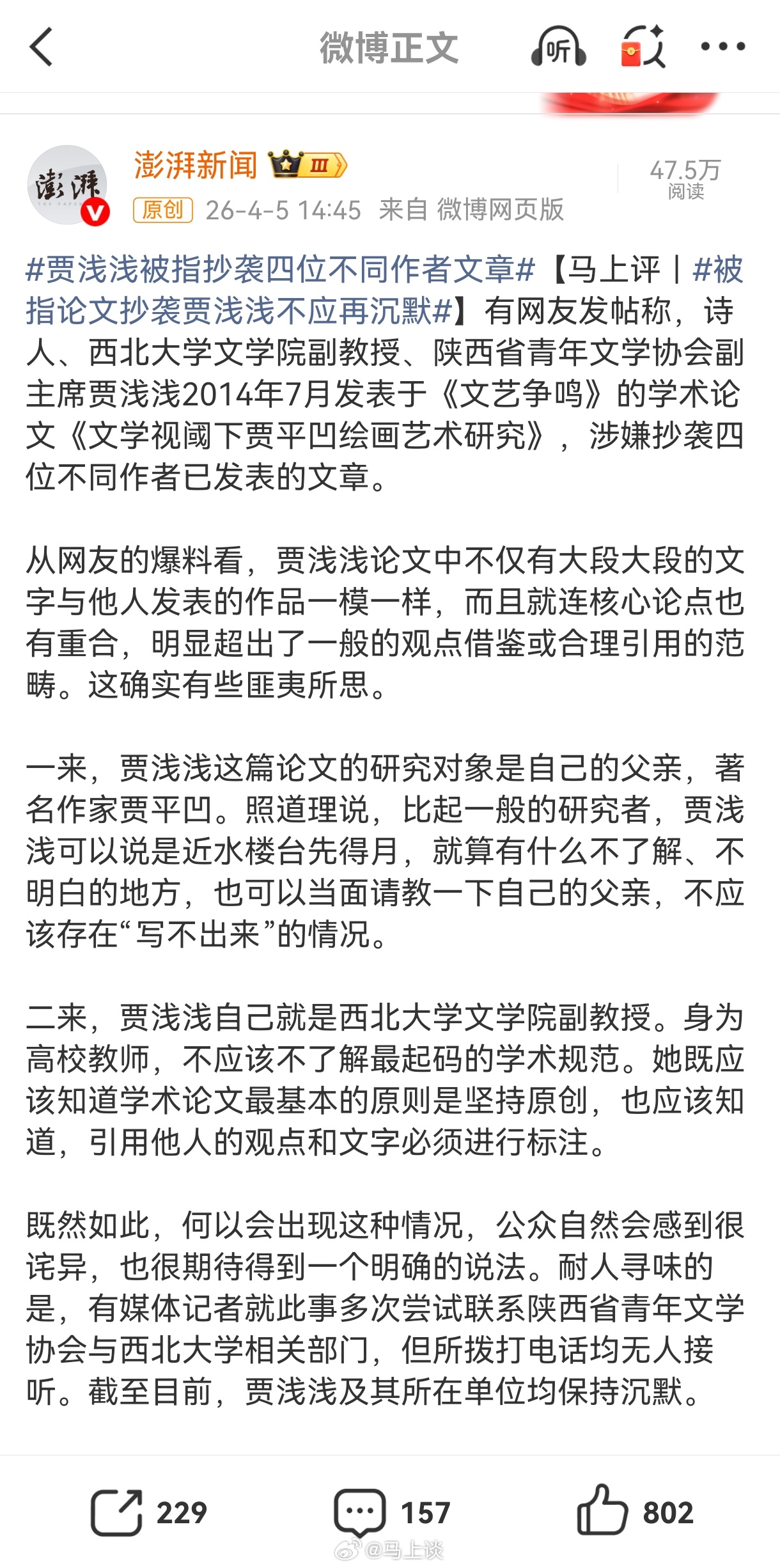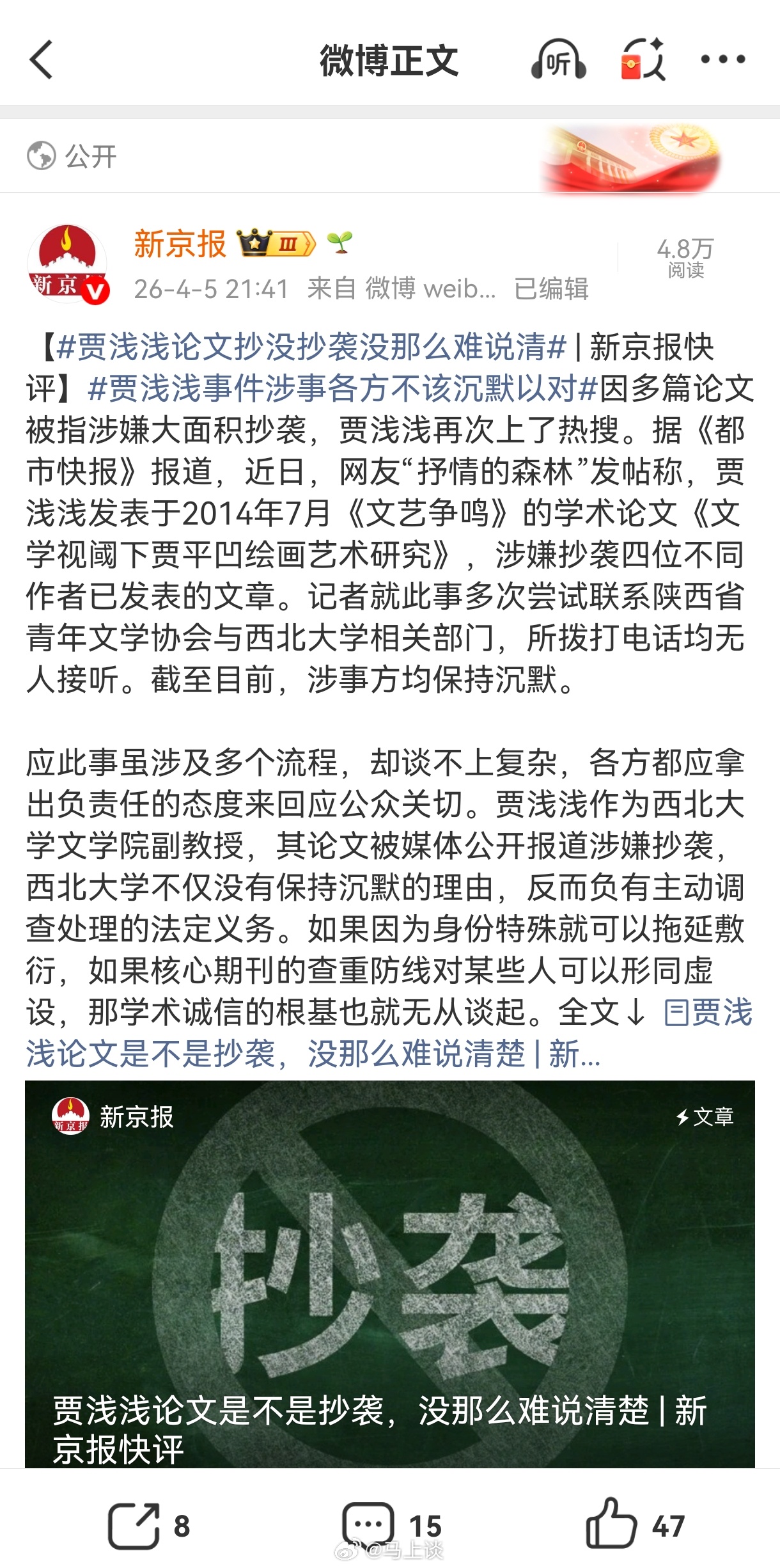 贾浅浅论文抄袭一事,西北大学既不回应,也拒绝多家媒体沟通,太离谱了,难道我们中国文坛还有一个“王”存在吗?需要一家高校这么避讳吗?