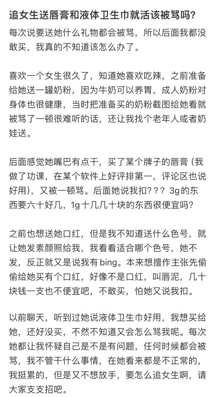 追女生送唇膏和液体卫生巾就活该被骂吗
