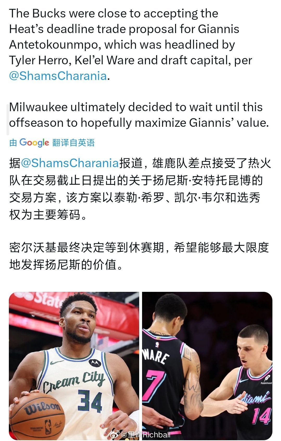 shams爆料,雄鹿交易截止日前差点同意和热火的交易,最终决定等到休赛期多捞点,