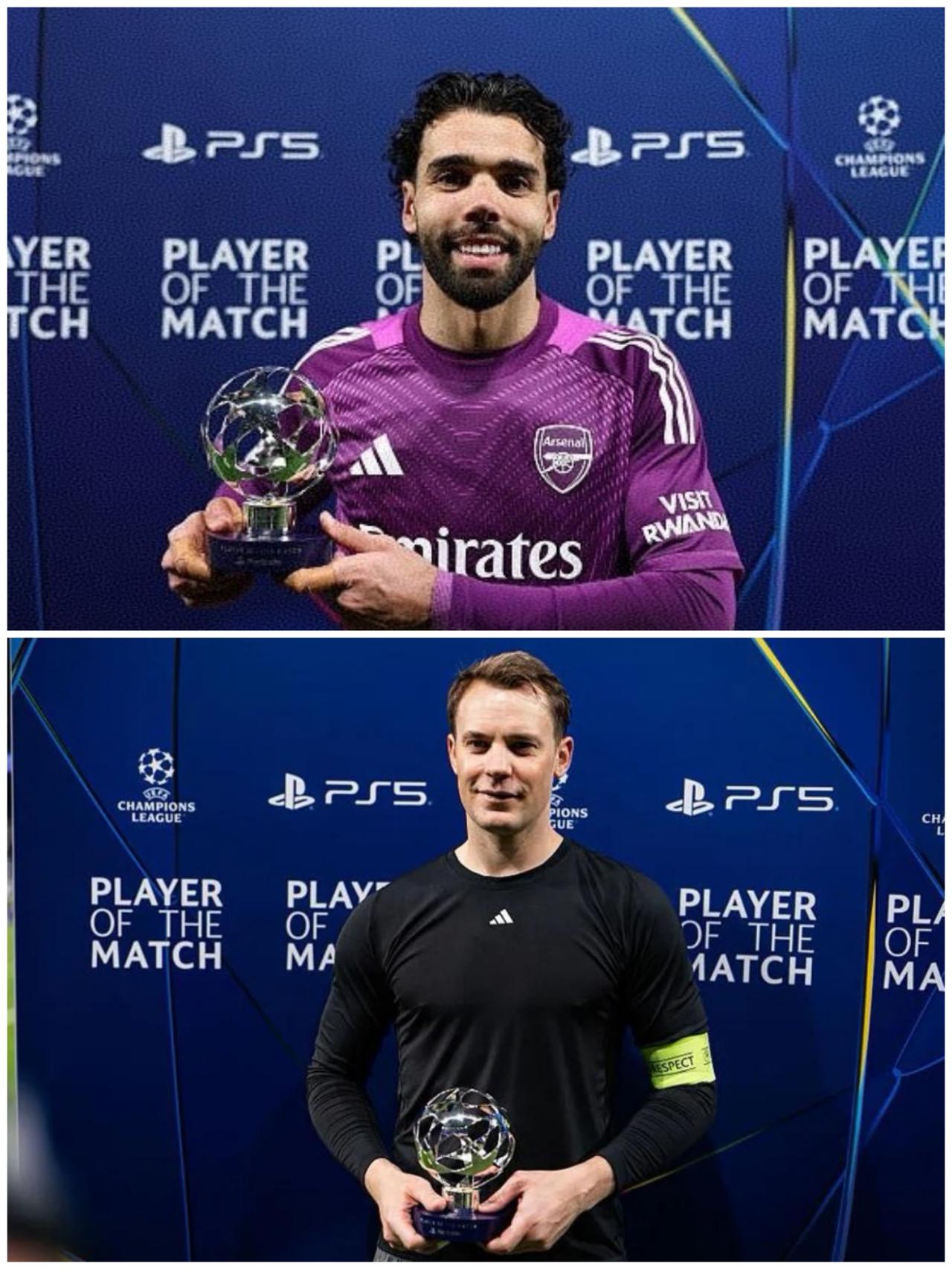 这是巧合吗?欧冠1/4淘汰赛的第一个比赛日,两场比赛的最佳球员都是门将!阿森纳以防守著称还可以理解,拜仁擅长的可是进攻,赢球最大功臣却是门将,确实有点意外!其实看看这两场比赛里门将的发挥你就不意外了! 拜仁门将诺伊尔:全场完成9次扑救,其中禁区内射门扑救次数5次,出击成功1次!这只是数据能体现的,数据体现不了的是他在上下半场两次扑出姆巴佩禁区内角度刁钻的射门,让拜仁保持住了领先优势! 阿森纳门将拉亚:全场完成5次扑救,这5次全是禁区内射门扑救,成功出击1次!比赛第83分钟,葡萄牙体育右路下底传中,卡塔莫前点甩头攻门,面对门将最难扑的半高球,拉亚侧身将球扑出,力保球门不失! 门将获得最佳球员一方面体现了两位球员出色的个人能力,另一方面也体现了杯赛的特点,那就是想要赢球必须做好防守,而好的防守首先就需要有一个好的门将!