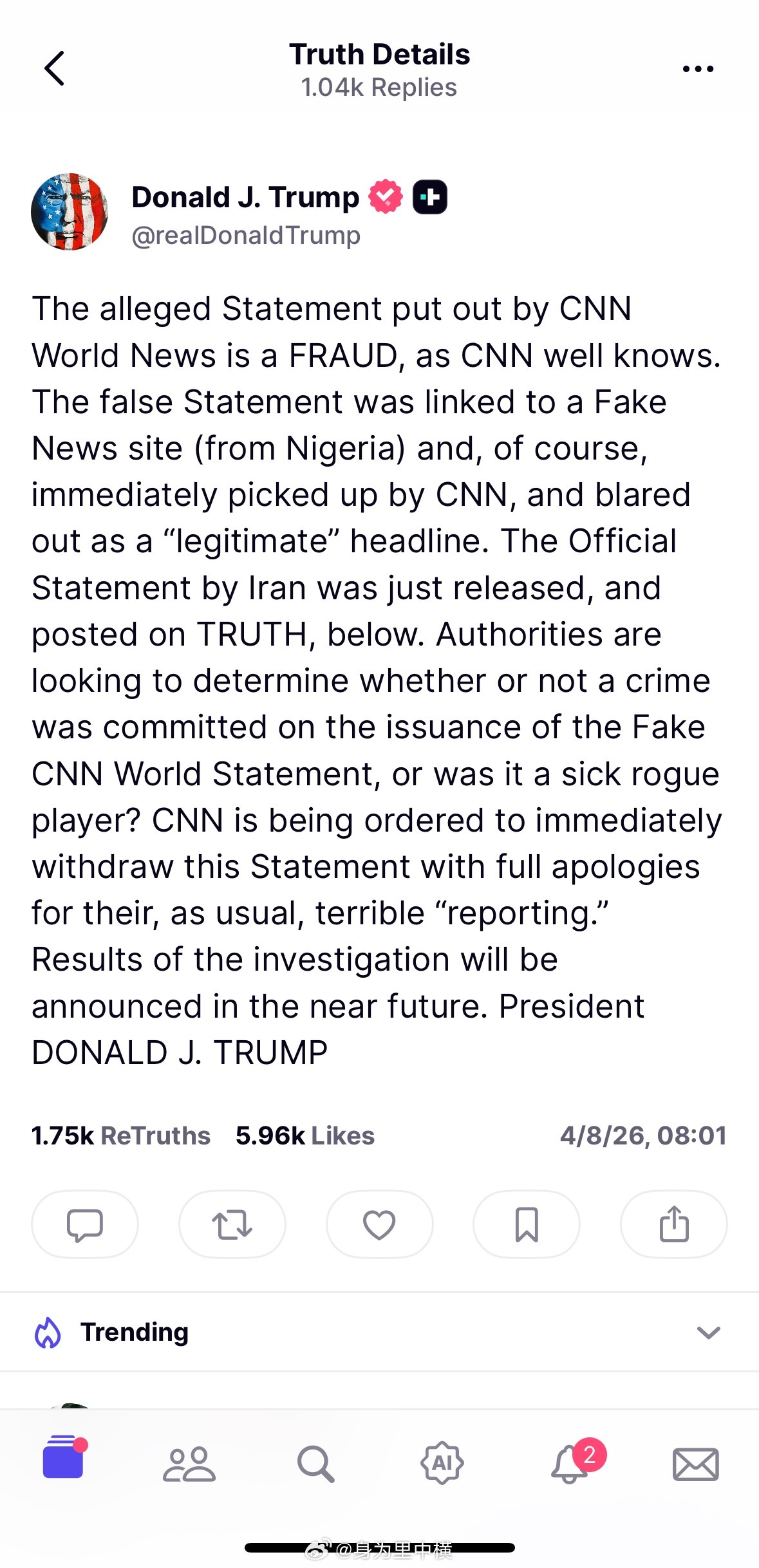 【特朗普指责CNN发布伊朗相关虚假声明】2026年4月8日,特朗普通过Truth Social平台发文称,CNN世界新闻发表的所谓伊朗声明为欺诈行为,与一个尼日利亚假新闻网站相关。CNN明知其虚假却立即采用并大肆报道。特朗普强调,伊朗官方真实声明已发布在Truth平台上。🚨他要求CNN立即撤回虚假声明并公开道歉,同时表示当局将调查发布假声明是否构成犯罪或属于“病态流氓”行为。👉特朗普与CNN的媒体对抗升级,调查结果即将公布。此事件可能进一步削弱CNN公信力,并加剧美国国内关于伊朗停火协议报道的争议。