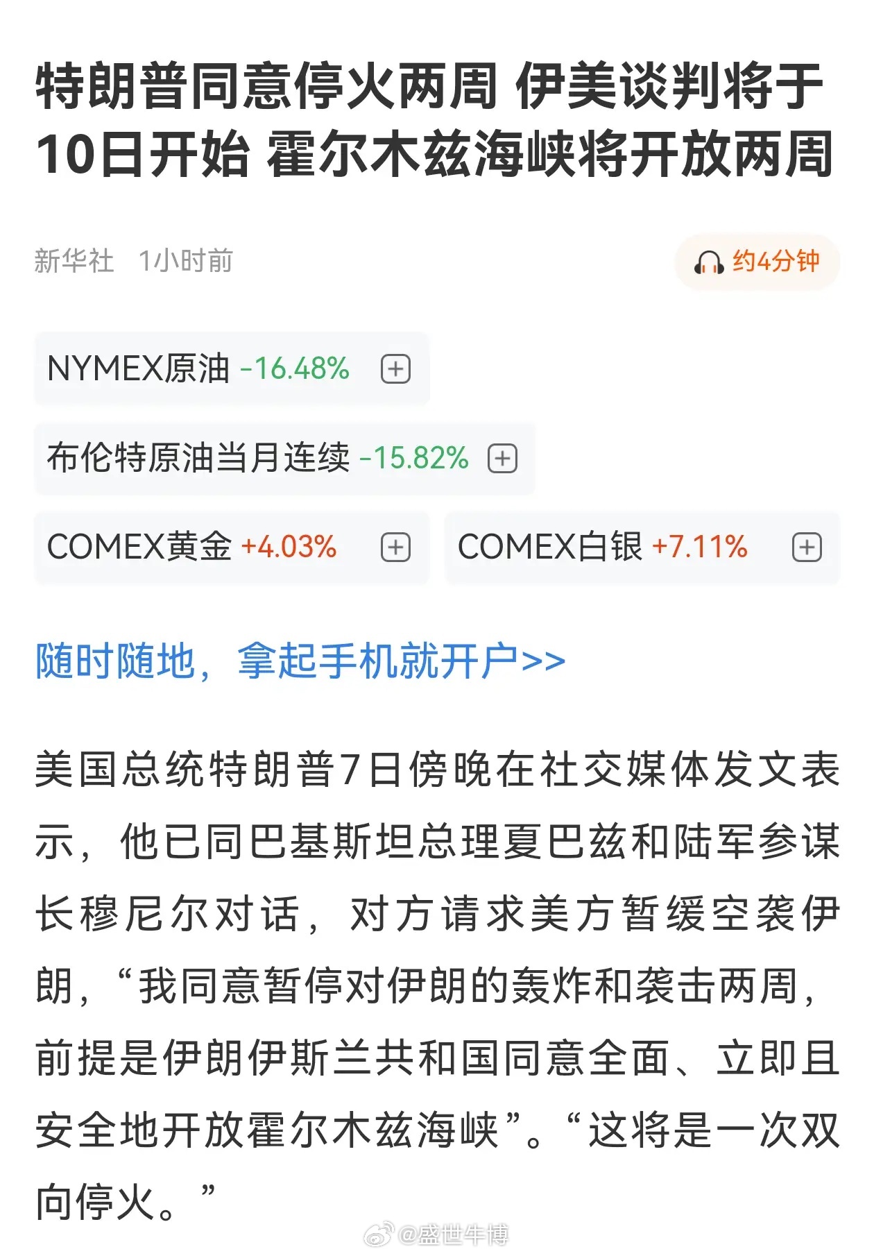 最后通牒的关键时点,没有升级的毁灭打击,而是同意停火两周,双方开启谈判,期间霍尔木兹海峡也安全开放。这转弯来的太突然了,但符合懂王的性格,停火谈判让老美保留剩下的体面,让伊朗避免更大的损失。最受益的还是资本市场,原油期货暴跌15%,不出意外股市会解除警报,开始上涨模式。