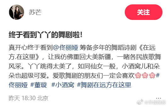 #苏芒去看了佟丽娅舞剧#【#苏芒佟丽娅董璇合影#】4月7日,晒出观看舞蹈诗剧《在远方·在这里》的照片,还晒出了与的合影。她发文称:“真开心终于看到筹备多年的舞蹈诗剧《在远方·在这里》,让我仿佛重回大美新疆,一睹各民族歌舞风采。丫丫跳得太美了,如同仙女一般,小酒窝儿和朵朵也超级可爱。爱歌舞剧的朋友们一定会喜欢。”(现代快报)更多消息:#倪虹洁1个人要赡养5个老人##离婚后倪虹洁和儿子变陌生##Angelababy邓超去看陈赫话剧##徐艺洋回应黄子韬身体状况##思文老公#(编辑:杨雨桐;审签:周乐瑞)